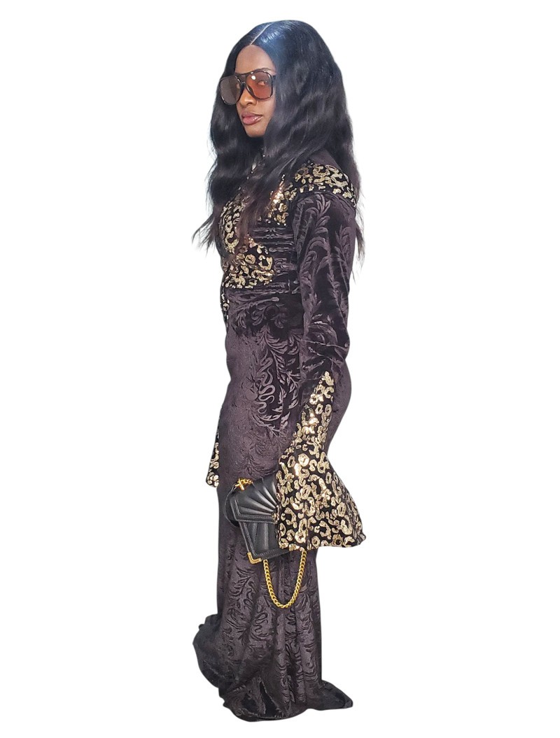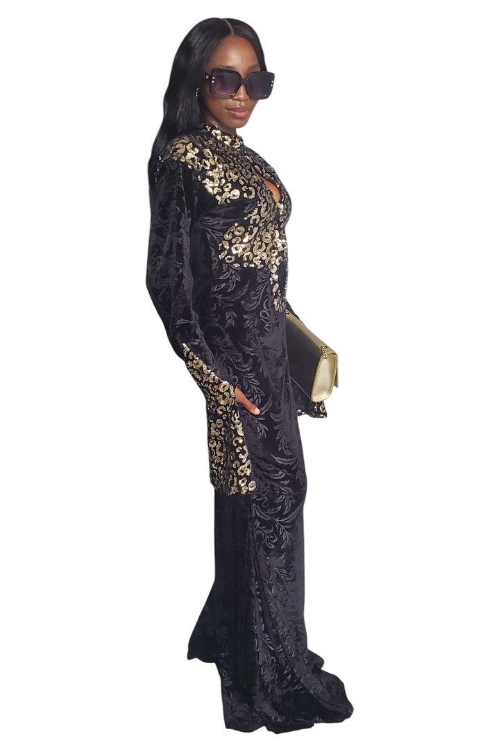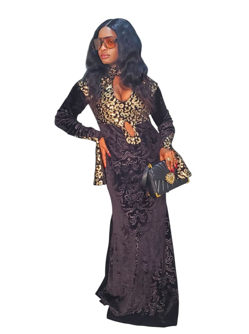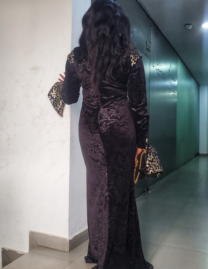 This dress will blow your mind! It's in a class of its own. Delicately handmade from luxury lush pattern velvet fabric, this piece is designed as a high-neck floor-length with keyhole opening at the bust area and navel area. A gorgeous sequin fabric is used to design the shoulders, bust and navel areas. This piece is form-fitting. It features statement sleeves and a zipper at the back. Kindly check bio for my number or send me an email at [email protected] to contact me directly and get faster responses for free consultations on accurate sizing OR check your inbox for ANKA emails notifying you of my reply when you drop a message here as I will ALWAYS reply your messages 🙏🏽🥰 To order 2 or more products from my store, you need a direct payment link created on the ANKA website for less charges. Kindly contact me. Exciting discounts await you💃🏾💃🏾💃🏾