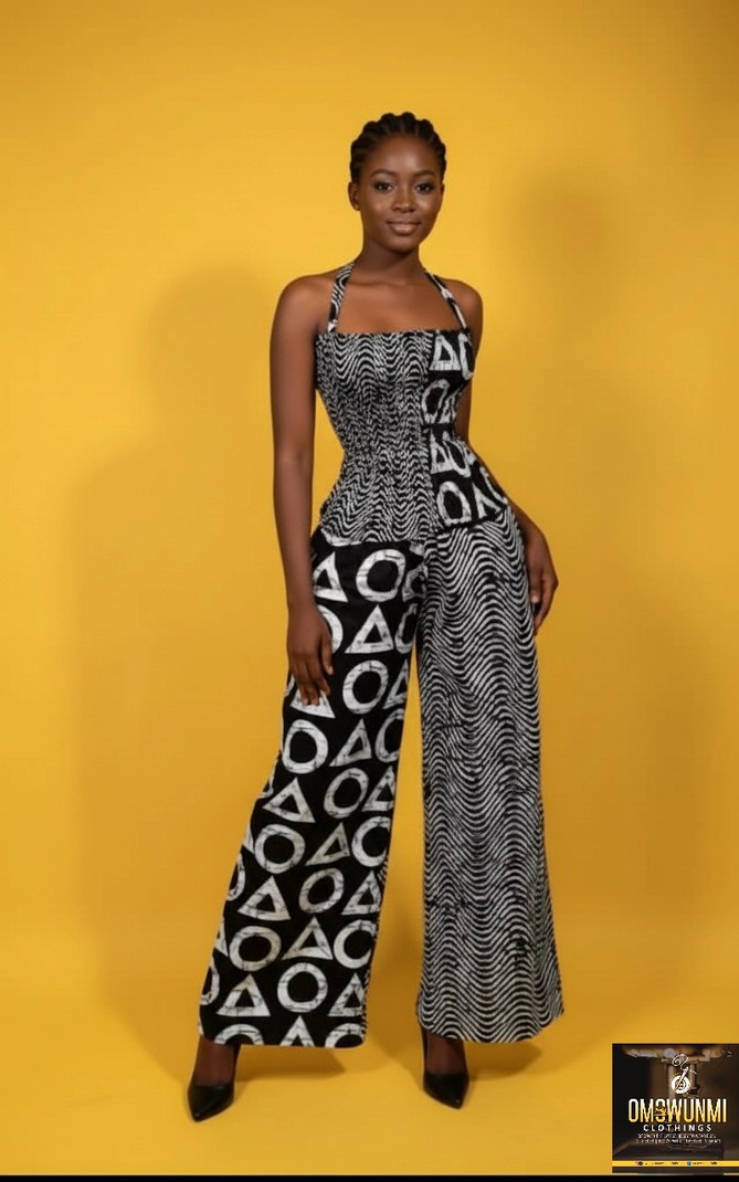 Introducing the two pieces halter smoker top and pant, a beautiful two-piece outfit featuring a bold, spiral tie-dye pattern in striking black and Crisp White. This set combines a flattering smocked halter crop top with a matching flowing pant, offering a look that's effortlessly chic and comfortable. It's the perfect statement piece for various occasions, from beach vacations, resort trips, and summer festivals to a stylish weekend brunch,weddings,naming etc. Complete the bohemian vibe by styling it with flat leather sandals or keep it elevated for evening events with espadrille wedges or neutral strappy heels.