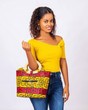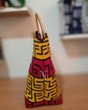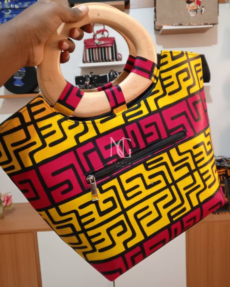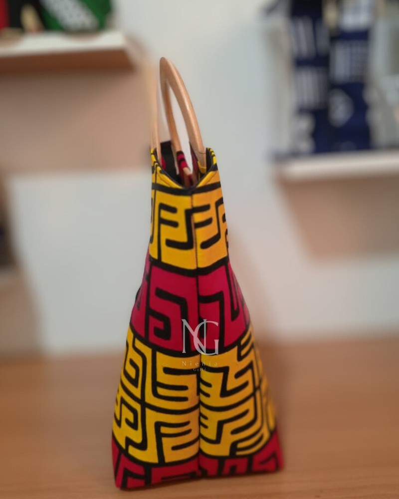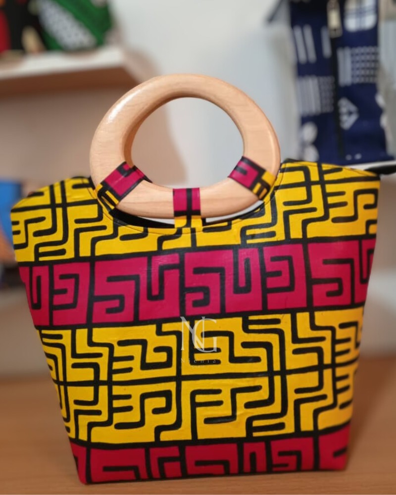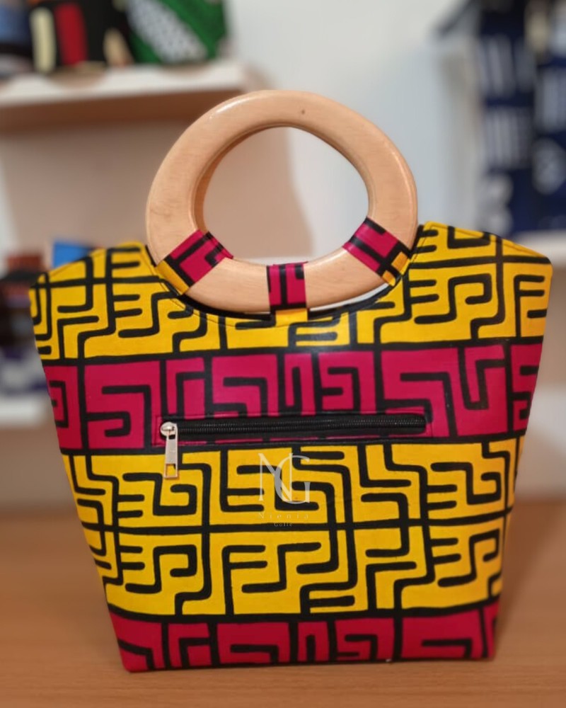 Ce sac en wax aux motifs ethniques mêle le jaune solaire et le rouge profond pour une allure vibrante et résolument africaine. Sa poignée en bois apporte une touche brute et naturelle, signature du fait main de qualité.