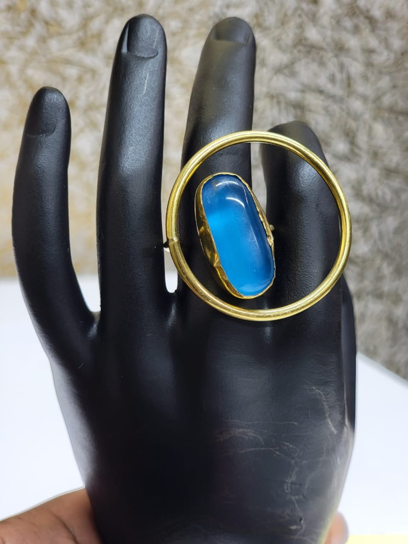 The ring features a bold design with a large, oval-shaped blue gemstone set in a gold-colored metal band. Order yours today to rock this gem!!
