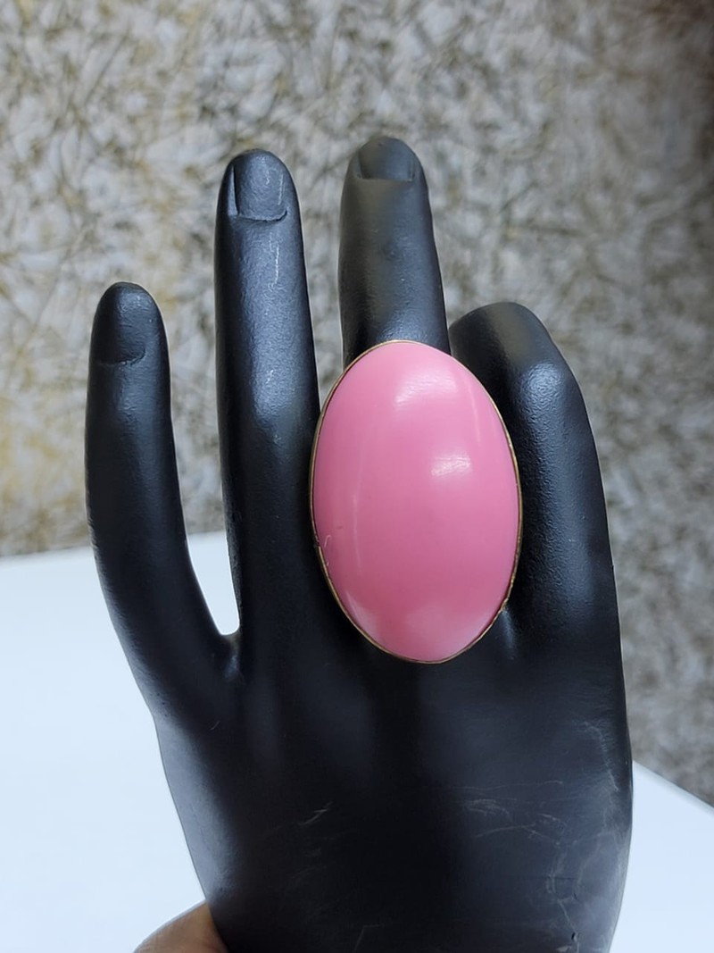 Elevate your style with this stunning ring featuring a large, oval-shaped pink gemstone, elegantly set in a sleek gold-tone band. Its bold design and vibrant hue make it a perfect statement piece for any occasion. Crafted for luxury and comfort, this eye-catching ring is a must-have addition to your jewelry collection.