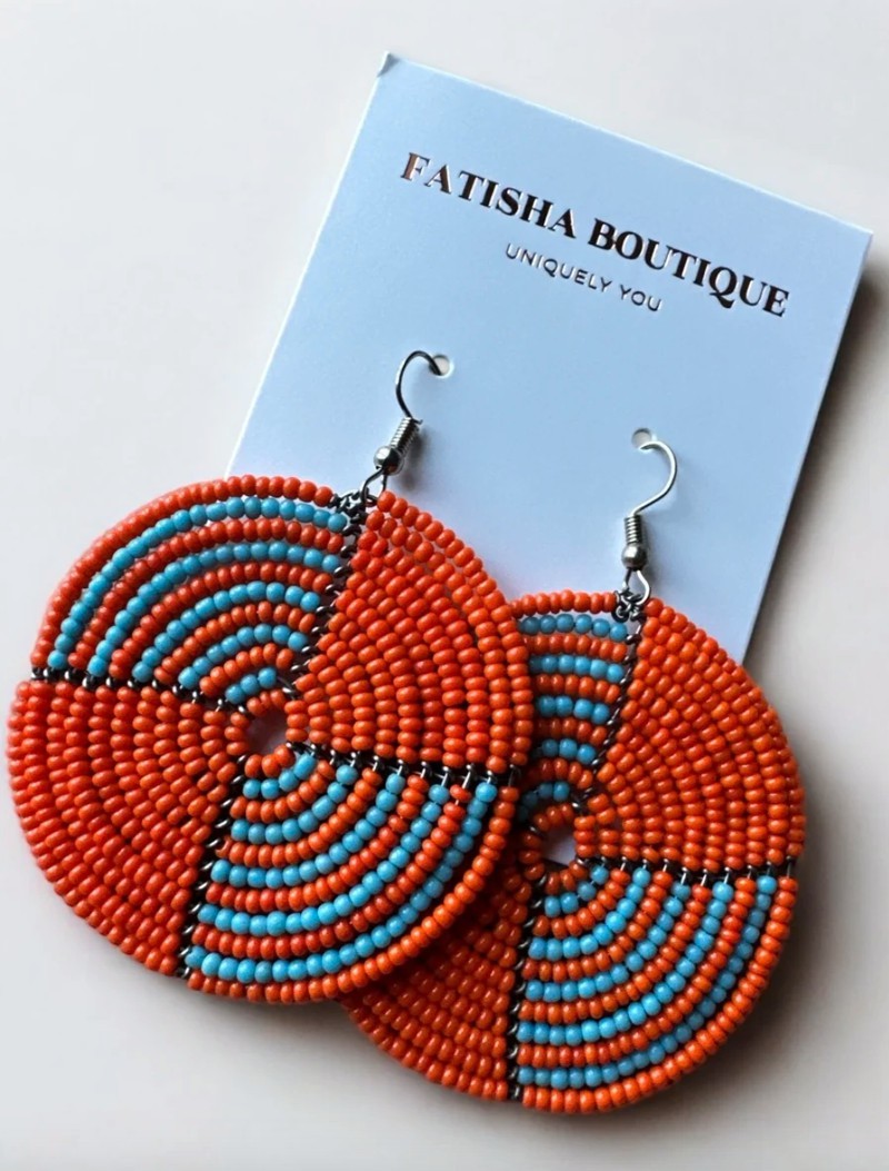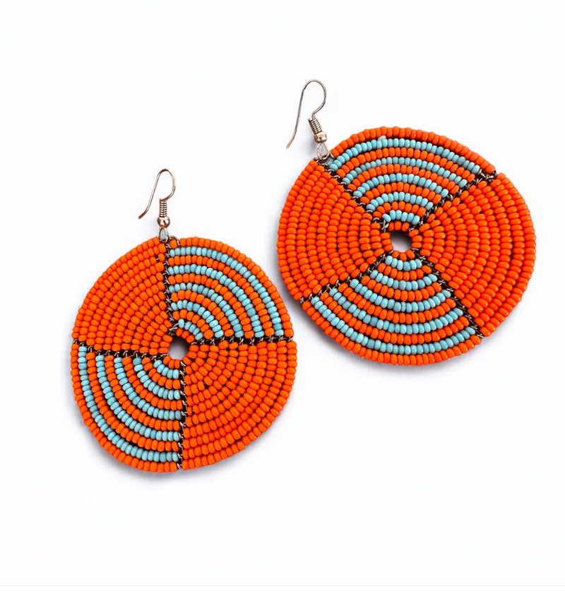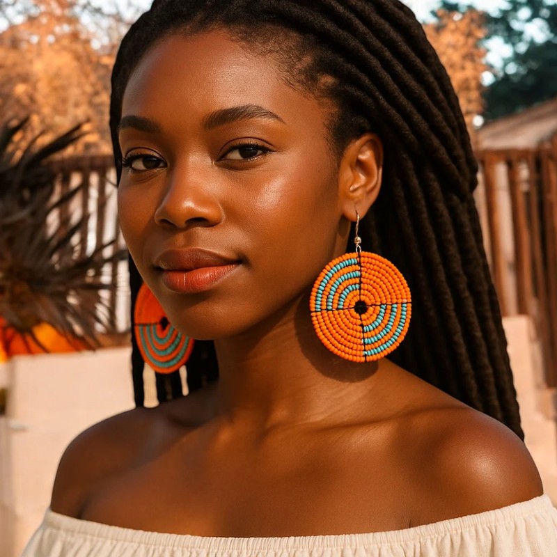 Celebrate bold expression with these Authentic African Orange Beaded Dangle Earrings, beautifully handcrafted with alternating sections of vibrant orange and sky blue glass beads. A signature piece from artisan African beadwork, these earrings blend tribal tradition and modern Afrocentric elegance. The symmetrical circular design symbolizes unity, energy, and cultural identity, making it a meaningful addition to any accessory collection. Perfect for everyday wear, festivals, or gifting, they bring a pop of colour and a proud heritage to your style.