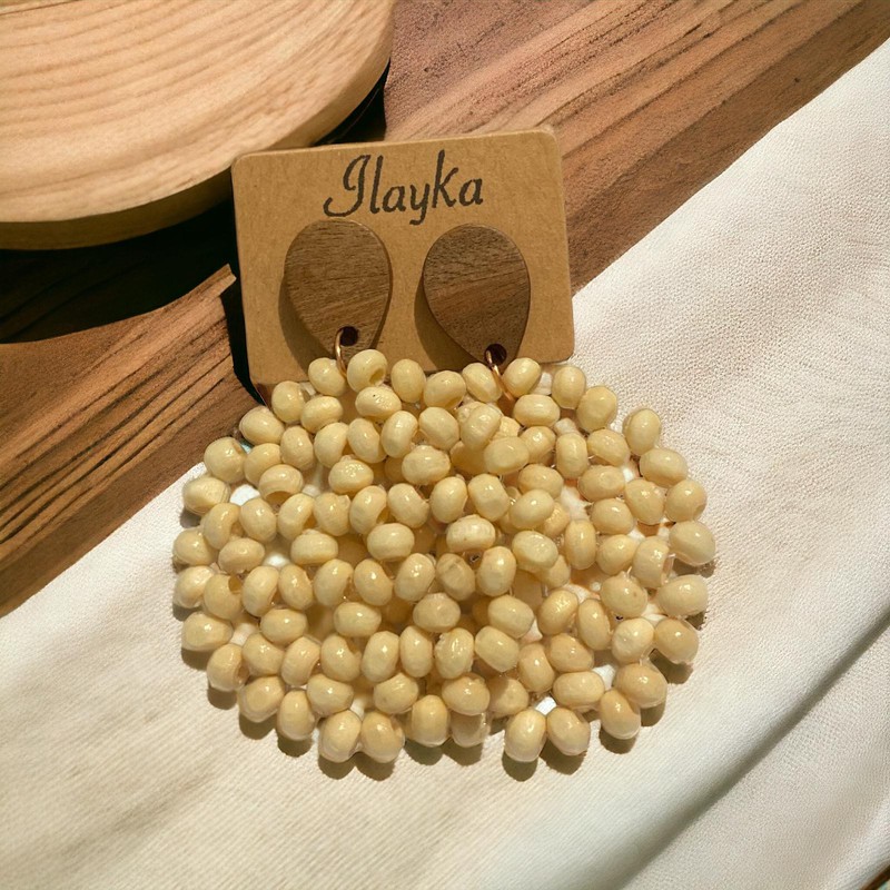 Ces boucles d'oreilles de la collection Wood Secret incarnent la sobriété raffinée en alliant bois brut et perles naturelles beiges . La partie supérieure présente des rectangles en bois lisse qui mettent en valeur les veines naturelles et les tons chauds du matériau, tandis que la partie inférieure forme un éventail circulaire composé de petites perles naturelles assemblées avec précision pour un effet aérien et texturé . Ces créations artisanales offrent un équilibre parfait entre structure géométrique et douceur organique, idéales pour celles qui cherchent à allier simplicité et sophistication .