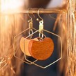 Ces boucles d'oreilles se distinguent par leur originalité créative alliant géométrie moderne et symbolisme naturel . Elles associent un cadre doré en forme d'hexagone qui met en valeur un pendentif en bois sculpté en forme de pomme .