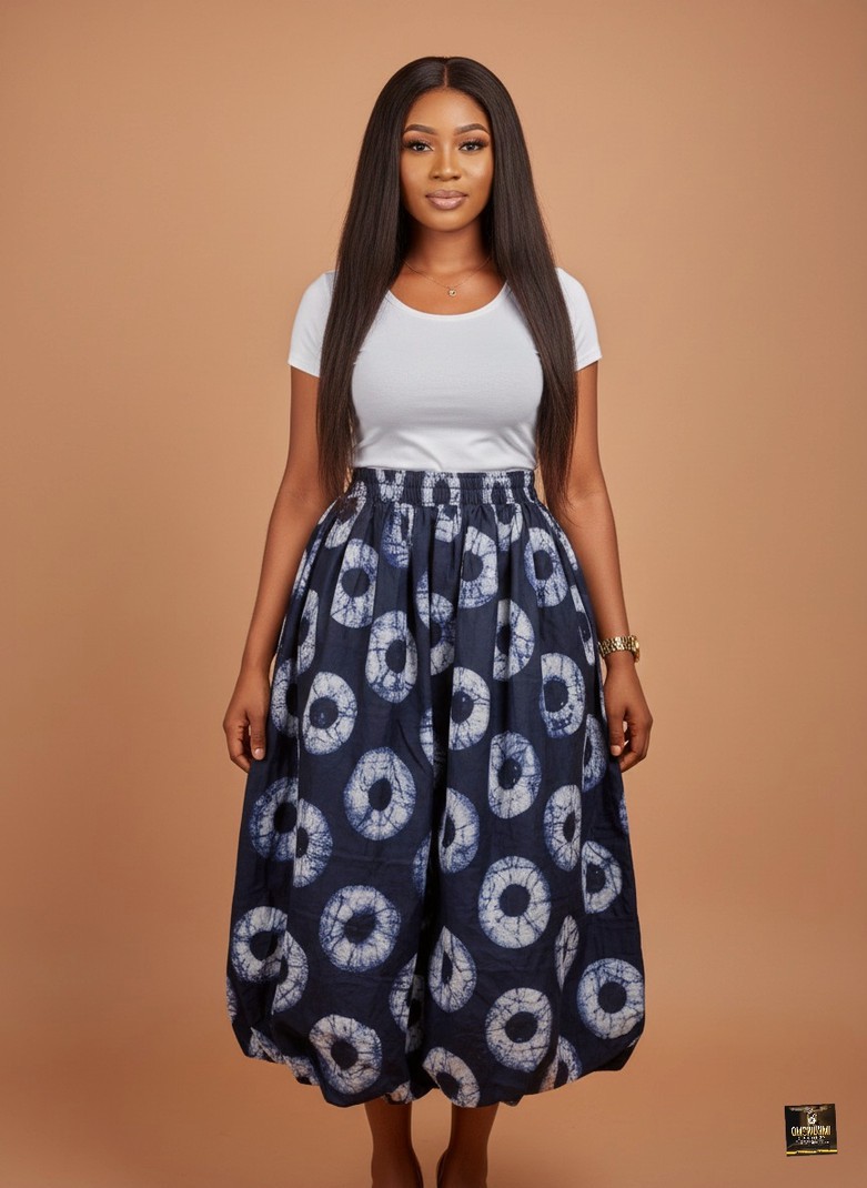 This striking piece is a pair of voluminous harem pants crafted from what appears to be a rich indigo-dyed cotton fabric, characterized by a vibrant and culturally rich print pattern reminiscent of Adire/Tie-Dye techniques, showcasing large, stylized circular motifs in a contrasting lighter shade against a deep, dark blue background. The pants feature a comfortable, gathered elasticated waistband and a signature bouffant silhouette that is exceptionally wide through the hip and thigh before gathering dramatically at the fitted ankle cuffs, defining the characteristic look of harem pants. This versatile garment, likely made from breathable, medium-weight 100% Cotton , is perfect for a variety of occasions: it is an exceptional choice for cultural and social events or vacation and resort wear due to its comfort and flow, and can be effortlessly worn for casual outings, yoga, or creative environments, offering a unique and relaxed yet sophisticated statement.