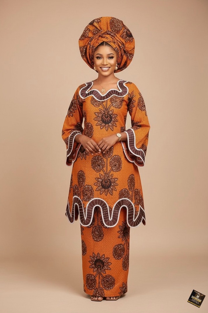 Step out in radiant warmth with this Burnt Orange and Chocolate Scalloped Skirt Set, a vibrant fusion of traditional wax print aesthetics and modern tailoring. The ensemble features a rich, amber-hued fabric adorned with bold, brown floral sunburst motifs that evoke a sense of earthy elegance. The true showstopper of this design is the architectural tunic, which showcases a distinctive wavy, scalloped hemline and neckline, all meticulously outlined in crisp white piping to accentuate the curves. This artistic detailing is mirrored on the three-quarter bell sleeves, creating a cohesive and polished look. Paired with a matching floor-length pencil skirt that streamlines the figure, this outfit is an impeccable choice for traditional weddings, thanksgiving services, or cultural galas, offering a regal "Rich Aunty" vibe that is both timeless and trendy.