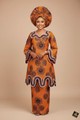 Step out in radiant warmth with this Burnt Orange and Chocolate Scalloped Skirt Set, a vibrant fusion of traditional wax print aesthetics and modern tailoring. The ensemble features a rich, amber-hued fabric adorned with bold, brown floral sunburst motifs that evoke a sense of earthy elegance. The true showstopper of this design is the architectural tunic, which showcases a distinctive wavy, scalloped hemline and neckline, all meticulously outlined in crisp white piping to accentuate the curves. This artistic detailing is mirrored on the three-quarter bell sleeves, creating a cohesive and polished look. Paired with a matching floor-length pencil skirt that streamlines the figure, this outfit is an impeccable choice for traditional weddings, thanksgiving services, or cultural galas, offering a regal "Rich Aunty" vibe that is both timeless and trendy. Material: Ankara Color: Multicolor