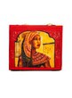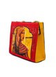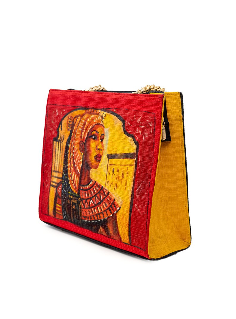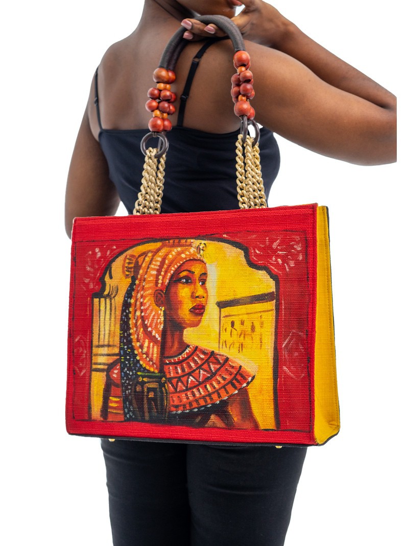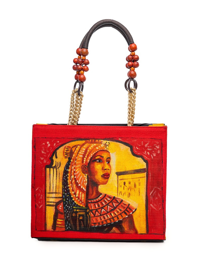 One-of-a-kind tote with hand-painted Cleopatra portrait on linen canvas, framed in bold red with golden side panels. Thick cotton fiber body, golden chain handles, and wooden bead accents. Durable yet light, combining art and function. Dimensions: H 12 in / 30.5 cm · W 6 in / 15.2 cm · B 14 in / 35.5 cm · Weight 1.6–1.7 kg Type: Tote Bag | Category: One-of-a-Kind Condition: New item