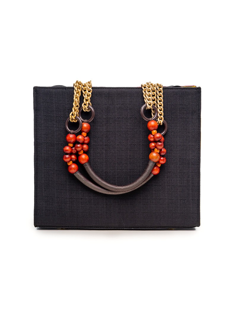 One-of-a-kind tote with hand-painted Cleopatra portrait on linen canvas, framed in bold red with golden side panels. Thick cotton fibre body, golden chain handles, and wooden bead accents. Durable yet light, combining art and function.