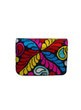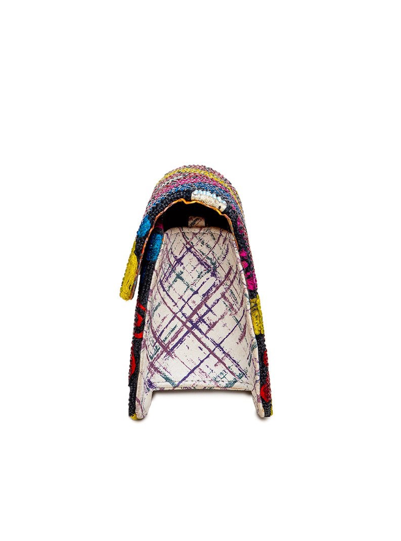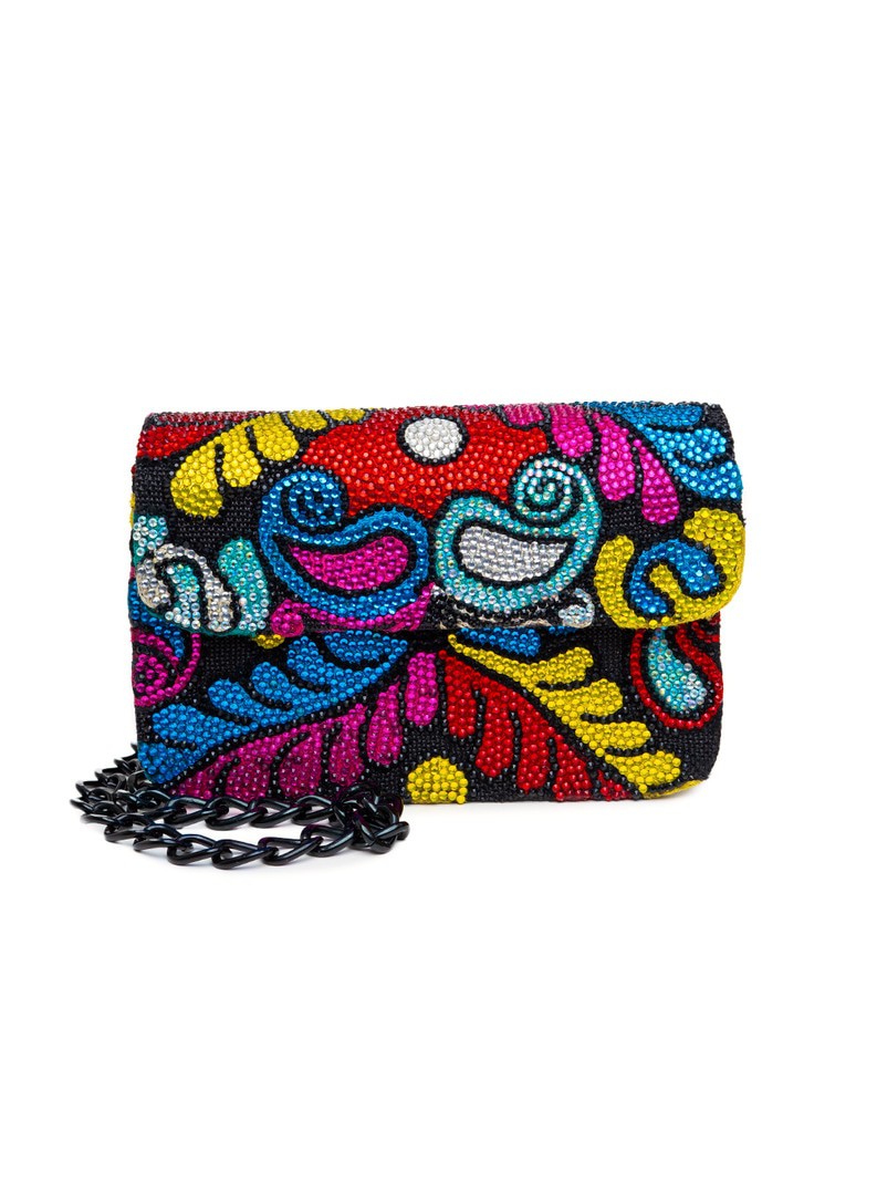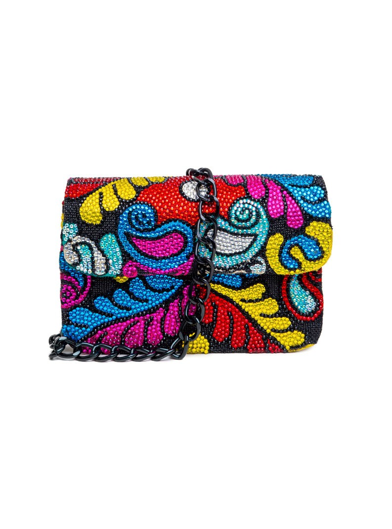 One-of-a-kind shoulder bag embroidered with ruby and scarlet roses, bordered by leaf curves and waves in orange, emerald, amethyst, and gold. Finished with hand-set zirconia and rhinestones. Cream suede sides with purple crosshatch provide contrast. Dimensions: H 6.5 in / 16.5 cm · W 4.2 in / 10.7 cm · B 10.2 in / 25.9 cm Chain Strap Drop: 36 in / 91.4 cm Type: Shoulder Bag | Category: One-of-a-Kind