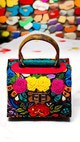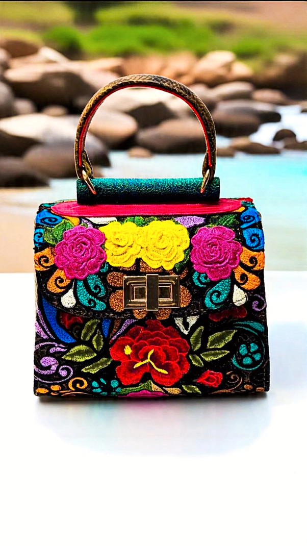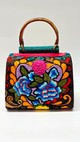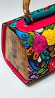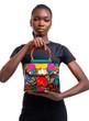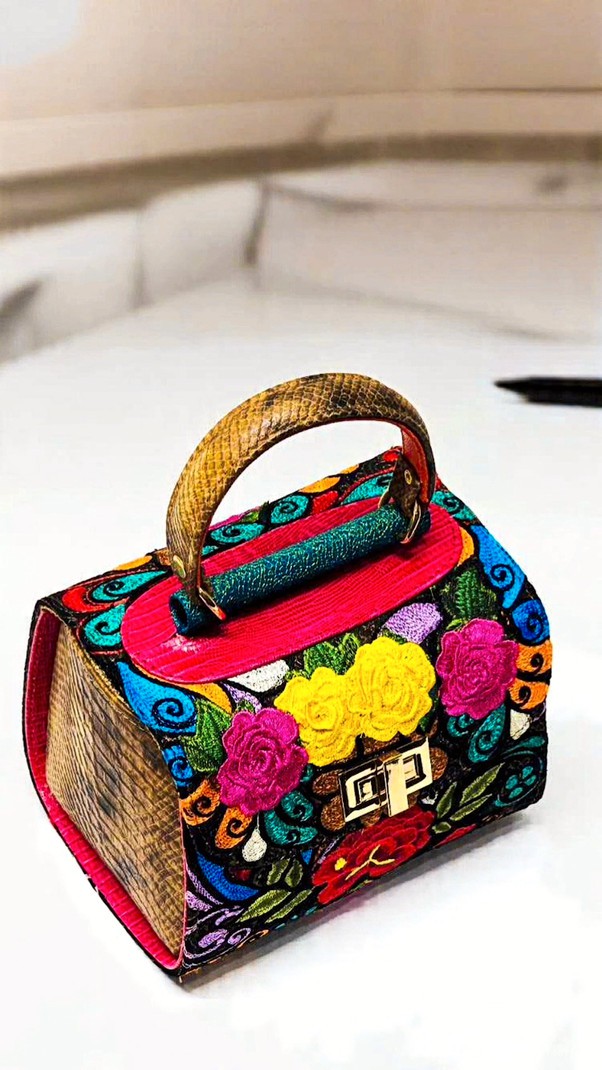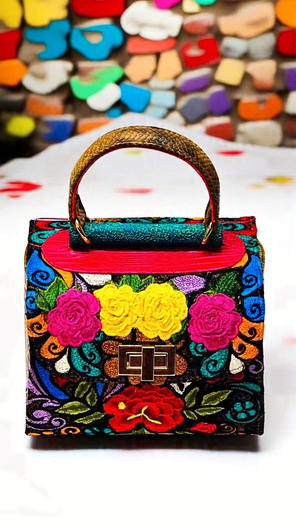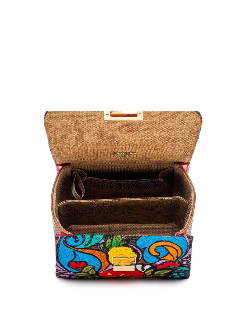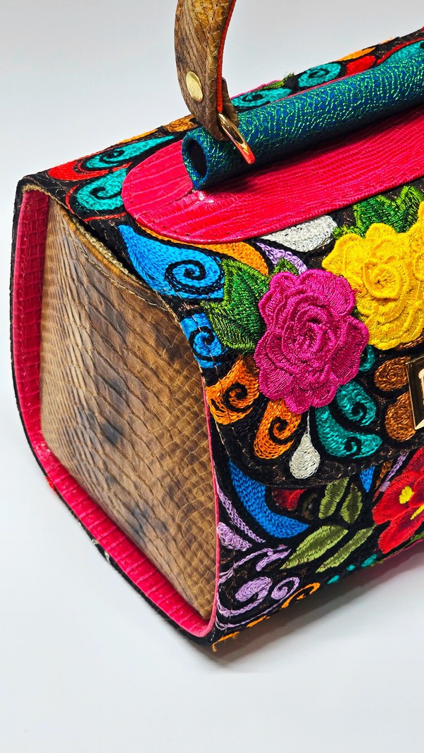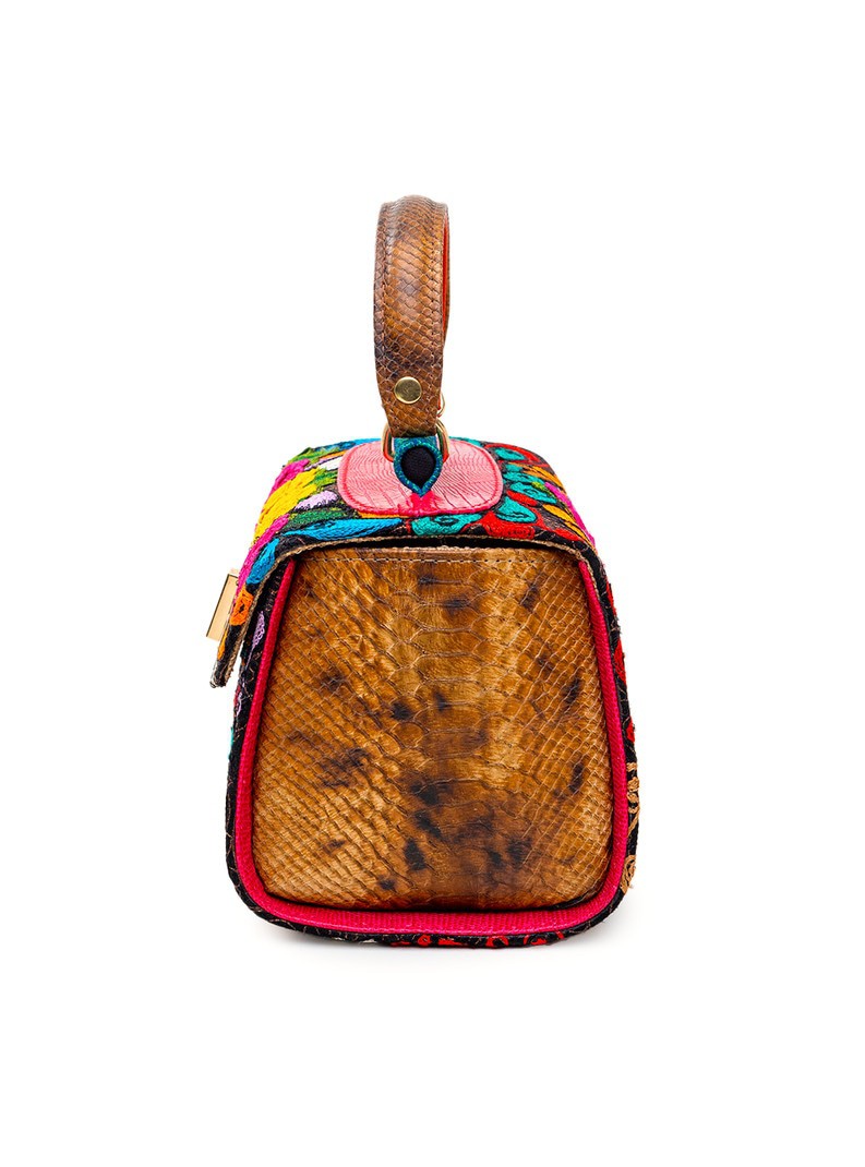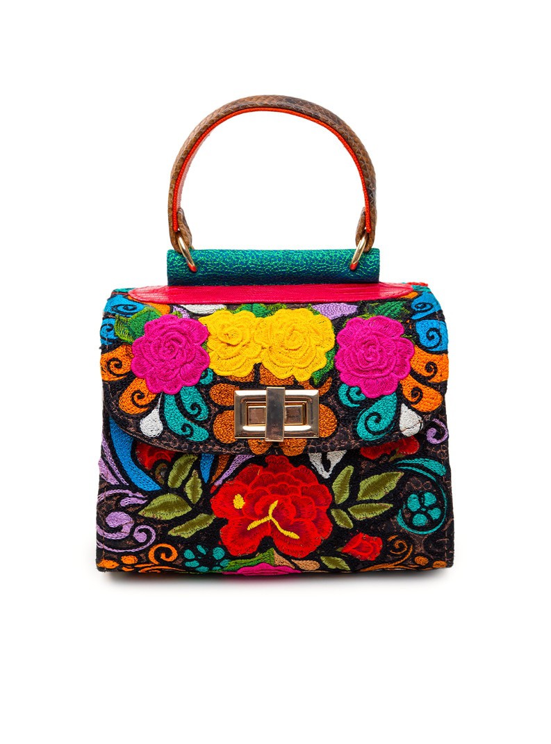 One-of-a-kind top-handle bag with floral embroidery in pink, yellow, scarlet, and deep blue on black. Each piece takes months to hand-embroider. Bronze snakeskin side panels, textured green spine, and rustic brown handle complete the form. Dimensions: H 12.5 in / 31.8 cm · W 6.5 in / 16.5 cm · B 9 in / 22.9 cm Type: Handheld Bag | Category: One-of-a-Kind
