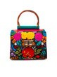 One-of-a-kind top-handle bag with floral embroidery in pink, yellow, scarlet, and deep blue on black. Each piece takes months to hand-embroider. Bronze snakeskin side panels, textured green spine, and rustic brown handle complete the form.