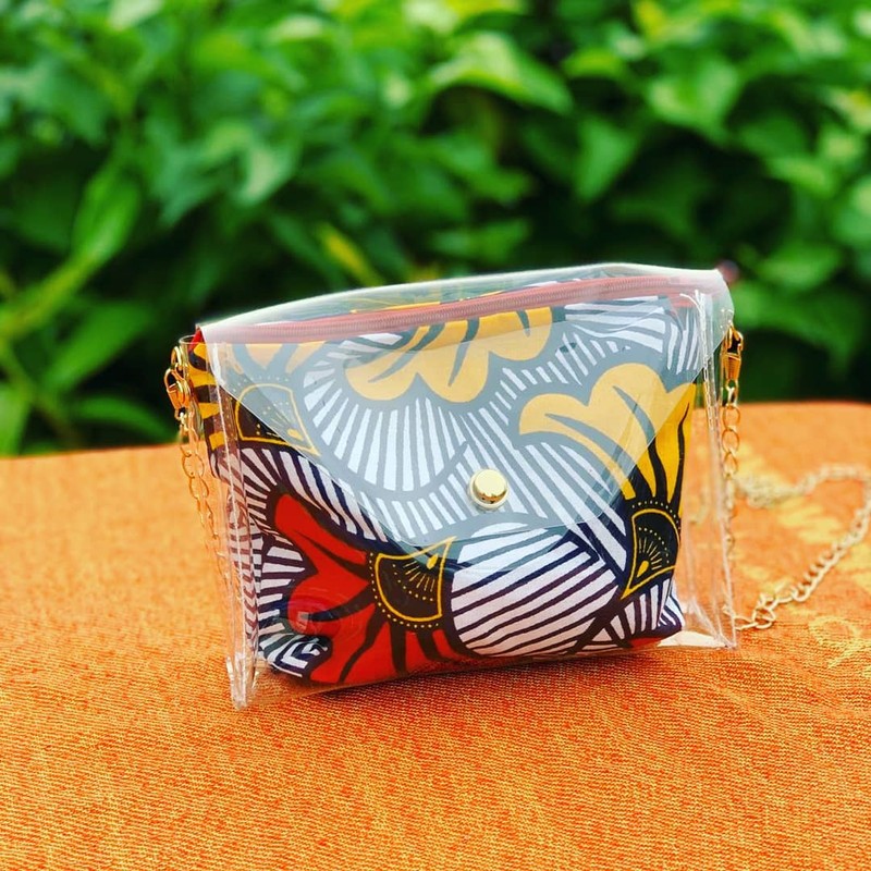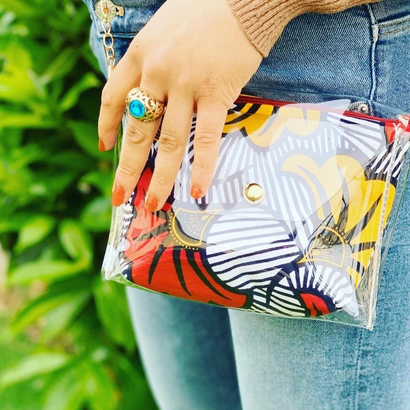 Magnifique petite pochette en wax faite main, support transparent Idéal pour vos petites balades d'été.