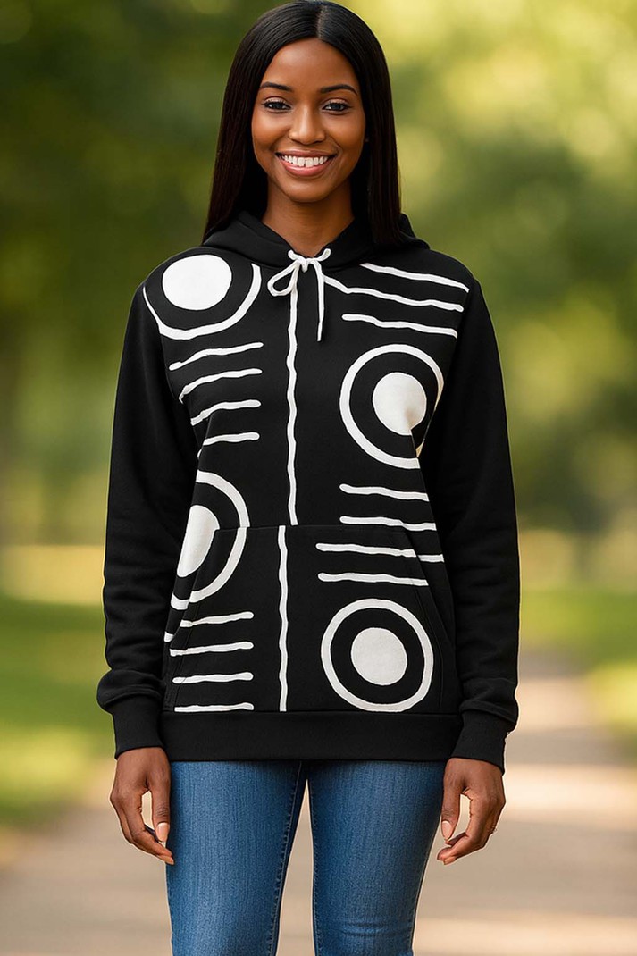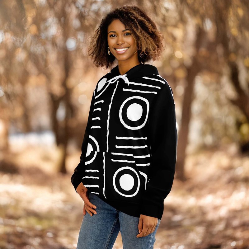 Add a touch of playful quirkiness to your wardrobe with our Hoodie Tribal African Mandala Print in classic Black and White. Stay cozy and stylish in this unique piece that features a fun and intricate tribal design. Perfect for any casual occasion. (Grab one now before they're gone!)