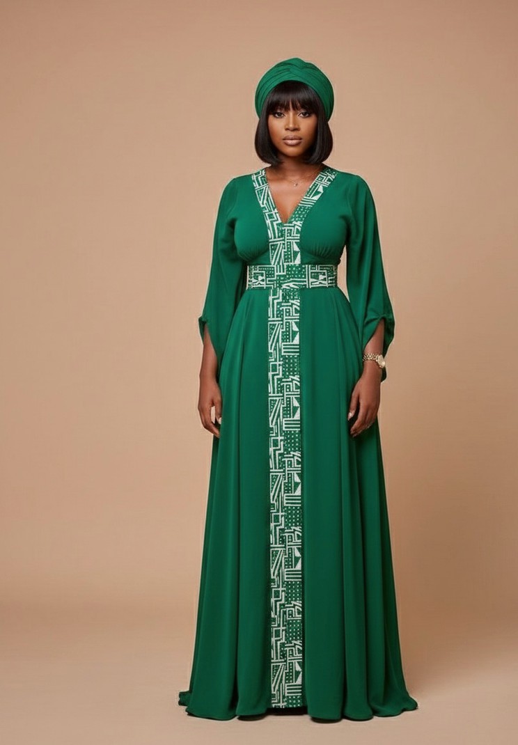 The Emerald Heritage Gown is a breathtaking blend of classic glamour and traditional African motifs, meticulously tailored from high-quality, fluid crepe fabric that offers a luxurious weight and an elegant, sweeping drape. This vibrant emerald green dress features a sophisticated cinched waistline and a deep V-neckline, both highlighted by intricate white-on-green geometric hand-printed panels that run vertically down the center to create a statuesque, elongated silhouette. The design is elevated by graceful bishop sleeves with split cuffs, adding a touch of contemporary movement to the floor-length, pleated skirt. Perfectly suited for formal evening galas, traditional wedding receptions, or high-profile milestone celebrations, this gown is a statement of refined grace and cultural pride. Whether paired with the matching headwrap for a complete look or worn alone, it ensures a regal and unforgettable presence at any prestigious social event.