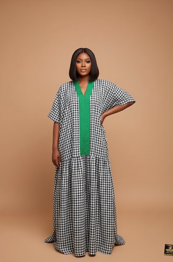 This chic floor-length maxi dress is a modern take on timeless patterns, featuring a classic black and white gingham check that extends through a voluminous, tiered skirt for a playful yet sophisticated silhouette. Meticulously crafted from premium, high-quality cotton-poplin, the fabric offers a crisp, breathable feel and a structured drape that holds its elegant shape throughout the day. The gown is defined by a striking, vibrant green V-neckline panel that runs down the center of the bodice, providing a bold pop of color that pairs beautifully with a sophisticated gold chain wristwatch and delicate gold jewelry. This versatile statement piece is an ideal choice for upscale outdoor events, garden weddings, or as a distinguished ensemble for a summer gala where you want to radiate effortless grace and contemporary style.