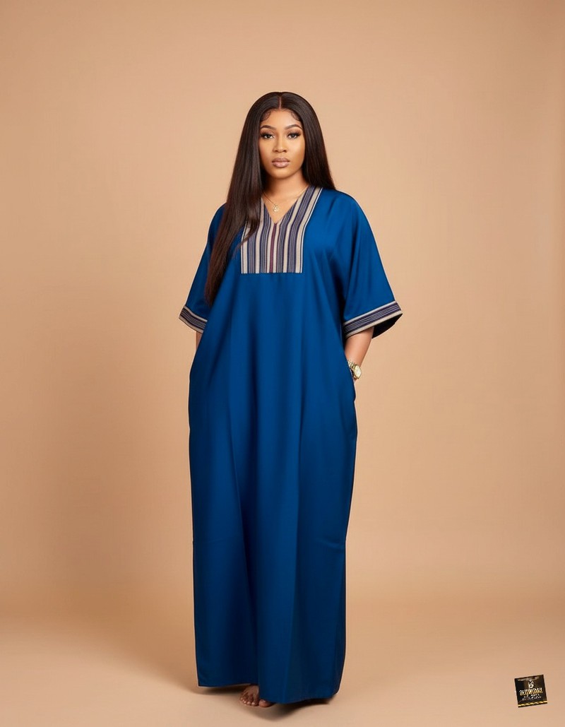 Embrace effortless elegance with our 'Regal Azure' Kaftan Dress, a piece that combines traditional silhouette with modern sophistication. This maxi-length dress is fashioned in a rich, vibrant royal or sapphire blue hue that exudes calm luxury. The signature Kaftan design features a comfortable, flowing fit and wide, elbow-length sleeves, ensuring a flattering drape for all body types. The V-neckline is the focal point, adorned with a striking, vertical pattern of contrasting stripes incorporating shades of gold, brown, and cream reminiscent of traditional woven fabrics . This detail adds an authentic, artisanal touch. The dress is likely crafted from a high-quality, opaque, and breathable fabric Crepe, making it comfortable for all-day wear. It also features practical, side-seam pockets. This versatile garment is perfectly suited for numerous occasions, including casual Fridays, a relaxed yet stylish look for brunch or day parties, religious and cultural gatherings like Jummah or Eid, or for an elegant, comfortable cover-up during a tropical getaway or cruise.