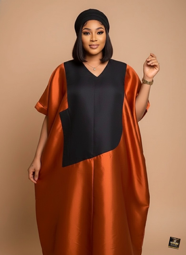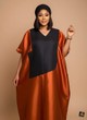 This striking caftan dress offers a powerful fusion of contemporary design and luxurious texture, guaranteed to make a sophisticated statement. The dress is constructed from a fabric with a beautiful, luminous sheen in a rich, warm burnt orange hue, draping into a generous, floor-length silhouette typical of the Kaftan style. The elegance is anchored by a bold, geometrically-shaped yoke panel across the chest in a contrasting matte black, featuring a deep V-neckline and angular lines that create a modern, color-blocked effect. This thoughtful combination of vibrant color and stark geometry, finished with a chic black turban, results in a luxurious and versatile piece that transitions seamlessly from elegant daytime wear to upscale evening occasions.