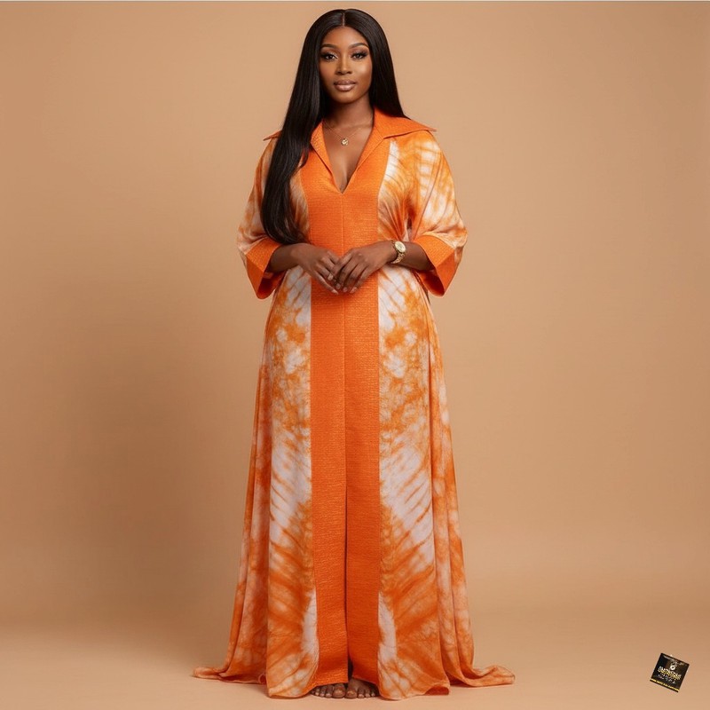 This stunning maxi dress, reminiscent of a gorgeous sunset, features a vibrant orange and white tie-dye pattern that embodies effortless chic. The flowing silhouette is shaped like a sophisticated kaftan, offering an elegant drape and comfortable, relaxed fit. It boasts a deep V-neckline leading to a wide, pointed collar, giving it a modern, structured appeal, while the long, voluminous sleeves end in a subtle cuff. A defining feature is the solid vertical orange panel running down the center front, which elegantly elongates the figure. Crafted from a lightweight and breathable fabric handwoven aso-oke, this dress moves beautifully. This piece is perfect for a wide range of occasions, including destination weddings, tropical vacations and resort wear, sophisticated garden parties, or as a standout garment for an elegant evening event. Pair it with delicate gold jewelry and sandals for a daytime look or with heels and a clutch for elevated nighttime glamour.