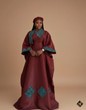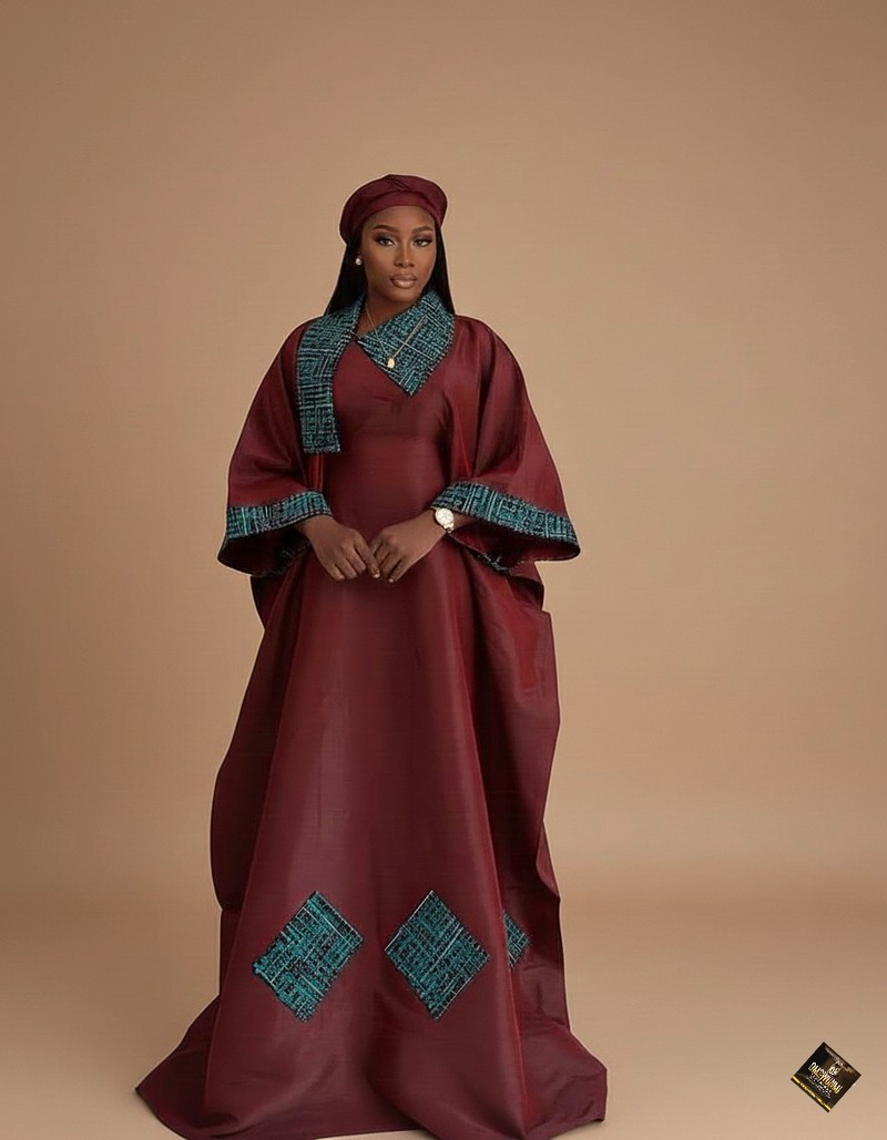 This spectacular maxi-dress is a masterpiece of traditional elegance and luxurious drape, offering a unique cultural statement for grand occasions. The ensemble features an inner sleeveless column dress paired with a dramatically oversized kaftan or boubou overlay, all crafted from a substantial, rich silk-blend fabric in a deep, regal burgundy hue. The standout detail is the contrasting African print fabric in a vibrant teal or turquoise color, which is used to line the shawl collar, trim the generous kaftan sleeves, and create striking geometric diamond-shaped appliqué panels on the skirt, infusing the look with vibrant heritage. This majestic and flowing garment, complete with a matching head wrap, is an ideal choice for occasions such as traditional weddings, naming ceremonies, and cultural festivals, upscale holiday gatherings, gala dinners, or any significant event where a dignified, sophisticated, and culturally rich ensemble is desired.