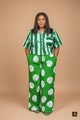 This vibrant and playful two-piece set offers a fresh, contemporary take on printed casual wear, perfect for making a bold statement with effortless comfort. The outfit comprises a cropped, short-sleeved button-down shirt and matching high-waisted, wide-leg trousers, both featuring traditional batik/tie-dye techniques in striking green and white. The structured, collared shirt utilizes a vertical stripe pattern, complete with a functional chest pocket, providing a tailored contrast to the voluminous, relaxed fit of the trousers. The pants are adorned with an oversized white polka dot pattern overlaying the green batik background, creating a cheerful, energetic ensemble that celebrates texture and pattern mixing.