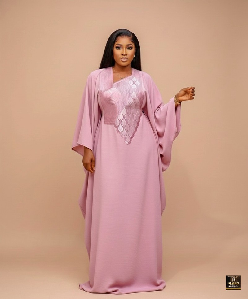 This majestic, floor-length gown is crafted from a fluid, crepe fabric in a soft, dusty rose shade, presenting a sophisticated and serene aesthetic. The dress follows a classic kaftan structure, featuring generously wide, draped sleeves that fall gracefully to the sides, providing an elegant and comfortable volume. The bodice is the focal point, featuring an asymmetric design where a contoured, fitted panel in a slightly contrasting, textured metallic or embroidered fabric is overlaid across the bust and shoulder area. This panel incorporates intricate details, including concentric circular stitching on one side and a sweeping, stylized feather or leaf motif on the other, executed in shimmering pink embroidery , creating a dynamic visual interest. This refined garment is perfectly suited for formal evening events, sophisticated cultural gatherings, or high-profile social occasions, such as gala dinners, formal mosque attendance, wedding receptions, or exclusive holiday parties, appealing to customers seeking glamour combined with a modest, flowing silhouette.