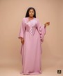 This majestic, floor-length gown is crafted from a fluid, crepe fabric in a soft, dusty rose shade, presenting a sophisticated and serene aesthetic. The dress follows a classic kaftan structure, featuring generously wide, draped sleeves that fall gracefully to the sides, providing an elegant and comfortable volume. The bodice is the focal point, featuring an asymmetric design where a contoured, fitted panel in a slightly contrasting, textured metallic or embroidered fabric is overlaid across the bust and shoulder area. This panel incorporates intricate details, including concentric circular stitching on one side and a sweeping, stylized feather or leaf motif on the other, executed in shimmering pink embroidery, creating a dynamic visual interest. This refined garment is perfectly suited for formal evening events, sophisticated cultural gatherings, or high-profile social occasions, such as gala dinners, formal mosque attendance, wedding receptions, or exclusive holiday parties, appealing to customers seeking glamor combined with a modest, flowing silhouette. Material: crepe Color: Pink