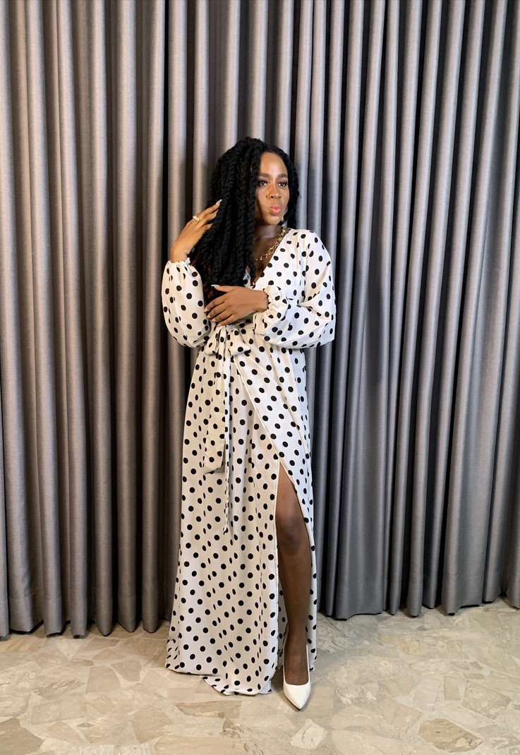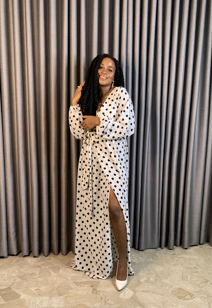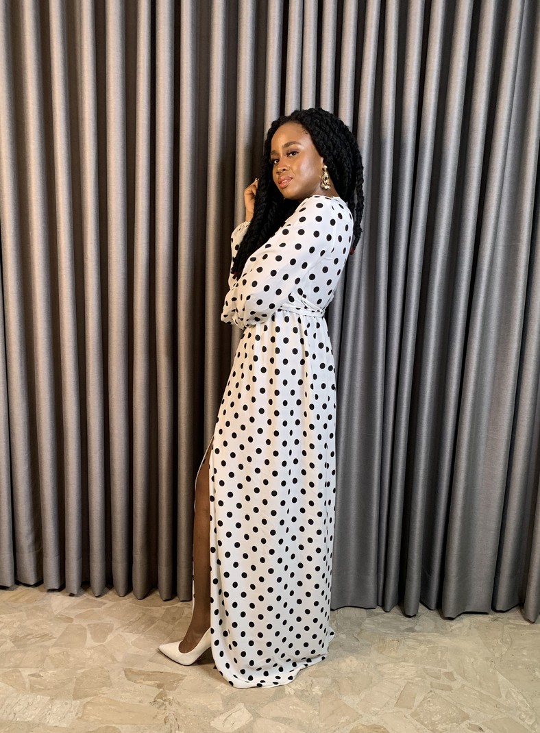 Add some timeless elegance to your wardrobe with this stunning black and white polka dot crepe wrap dress. Pair it with some heels and statement jewellery for a truly show-stopping look. Crafted from high-quality crepe fabric, Ivy feels soft and silky against your skin, and the lightweight material ensures all-day comfort. The long length and flattering shape make it the perfect choice for formal events, weddings, or a night out on the town.