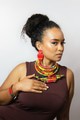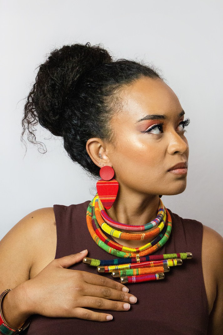 La parure Karayib célèbre la richesse du tissu madras, emblème des cultures caribéennes et africaines. Colorée, vibrante et pleine de caractère, elle habille la Queen qui veut affirmer ses racines avec modernité.