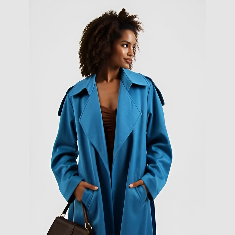 Design Details: Wide lapel for architectural elegance; roomy pockets for function and ease.