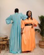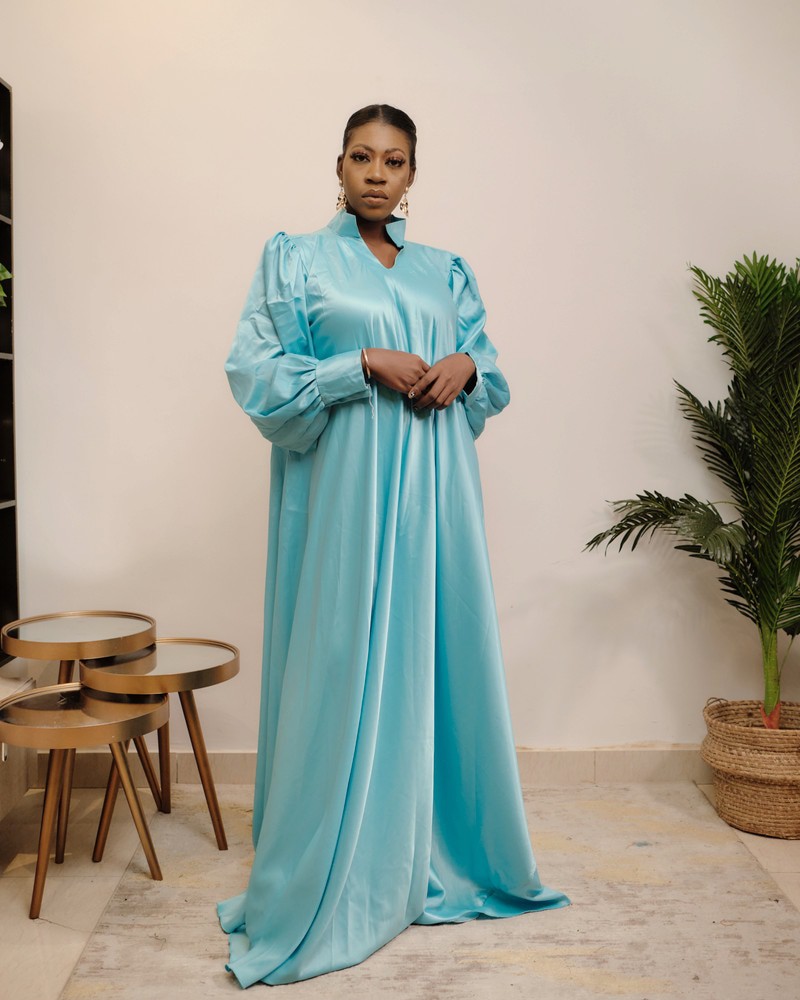 A free flowy semi elaborate long hand, V-cut turtle neck Boubou/Kaftan dress made with duchess silk. The regal outfit is fit for a queen - for all occasions - Lounge Wear, Dinner, Hangouts, Weddings, Birthdays and Events and of course our favorite everyday wear. Dress details: ● Long free flowing ● Turtleneck ● Puff sleeves with cuffs Care Instructions: Hand wash separately using a mild detergent. Press on the reverse side with a cool iron. Do not machine wash. Do not bleach.