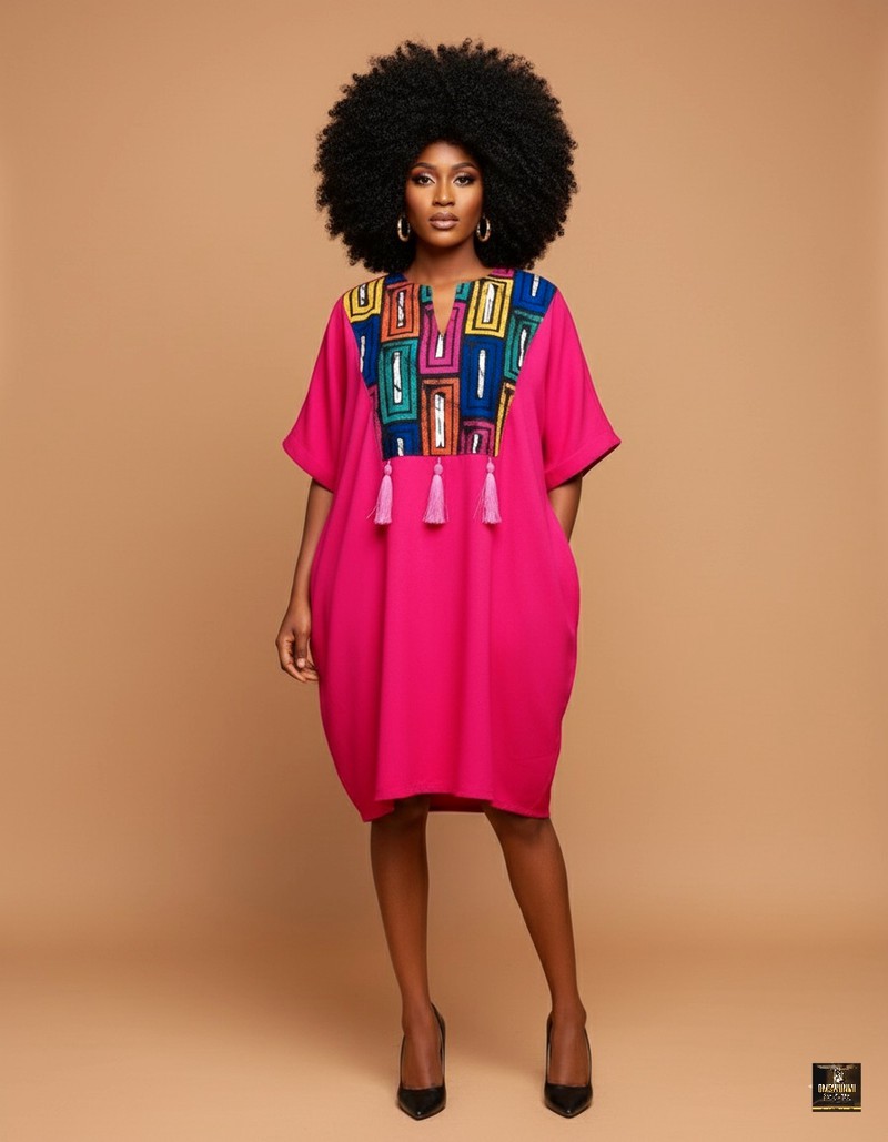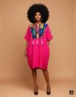 Vivid and captivating, this fuchsia kaftan dress features a rich geometric embroidered panel in blue, gold, and green hues. The front tassel accents add a touch of artisanal charm, while the loose, rounded silhouette flatters all body shapes. A radiant choice for stylish daytime events or elegant resort outings.