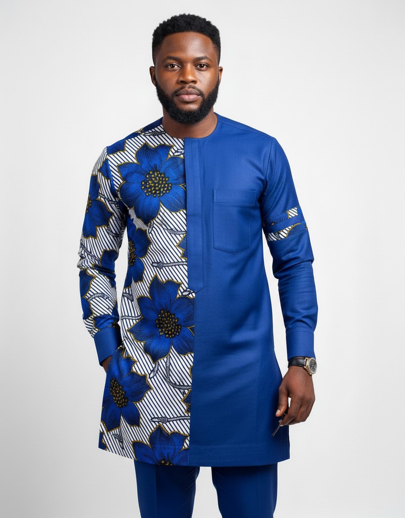 Style Name: Asymmetrical Panel Tunic Set / Half-and-Half Dashiki / Modern African Two-Piece Material: Tunic & Trousers: High-Quality Suiting Fabric | Accent: Authentic Ankara Wax Print Color: Main: Royal Blue | Print: Blue, White, Black (Large Floral Pattern) Design: Long-sleeve Tunic Top with Vertical Half-and-Half Panel Design; Mandarin Collar; Print accents on the solid sleeve; Matching Tailored Trousers Occasion: Weddings (Groom/Guest), Galas, Cultural Events, Engagements, Photo Shoots Gender: Men's Set Includes: 1x Long-Sleeve Tunic Top; 1x Matching Trousers Fit Note: Modern Tailored Fit Care Instructions: Dry Clean or Hand Wash Recommended (to protect the print) ✂️ Custom-Made Ordering This outfit is available for custom tailoring to ensure the perfect fit! Please send your accurate body measurements (Chest, Neck, Sleeve Length, Trousers Waist, Inseam, etc.) upon ordering to guarantee the best result for your bespoke garment.
