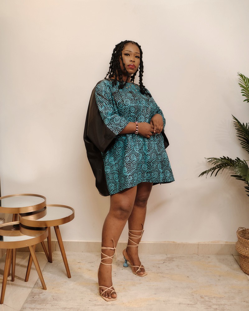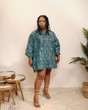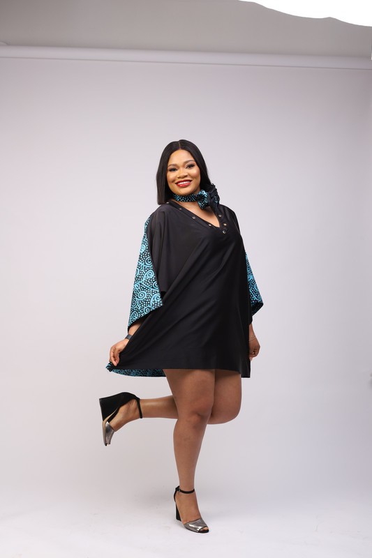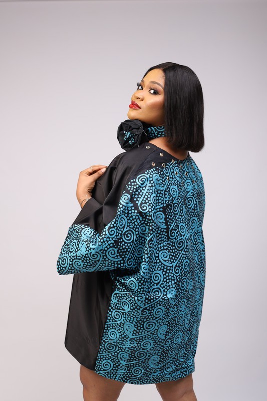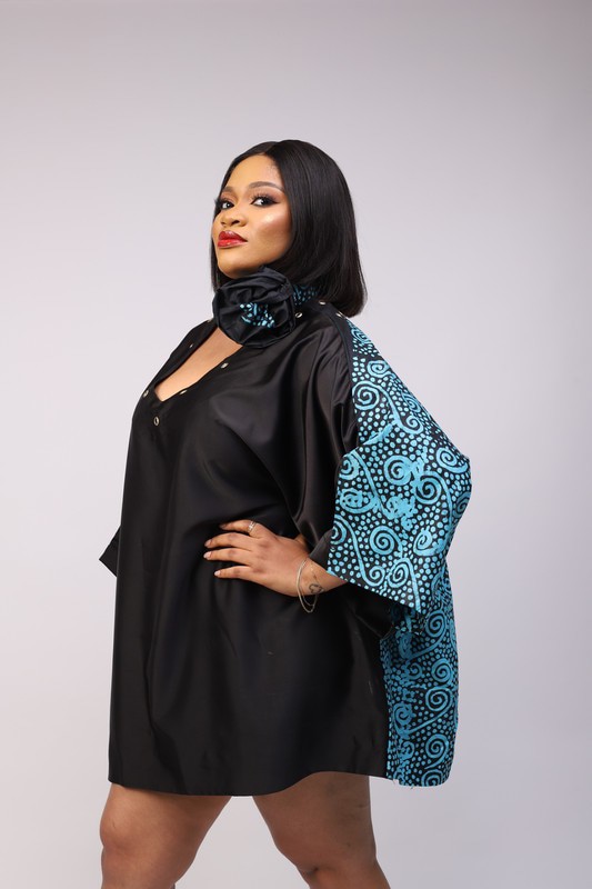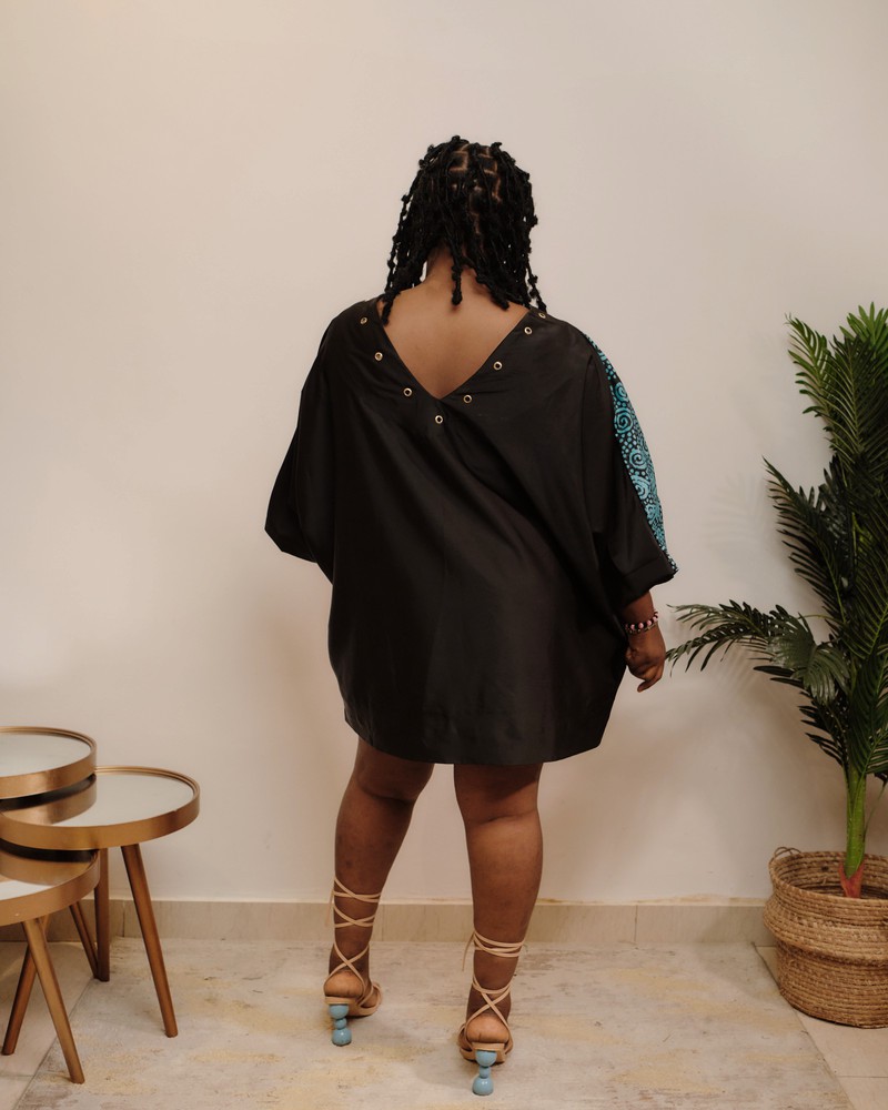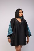 A free Boubou/Kaftan short dress made with a beautiful combination of 100% cotton Adire/Batik material and duchess. The dress has a canoe neck in front and a low cut V - neckline designed with gold eyelet holes at the back giving that touch of sexy. The midi dress is perfect for - Dinner, Hangouts, Weddings, Birthdays and Events and of course our favorite Everyday Wear. Made with skin friendly fabric. Color: Black & blue Fabric: Cotton adire & duchess silk Care Instructions: Hand wash separately using a mild detergent. Press on the reverse side with a cool iron. Do not machine wash. Do not bleach.
