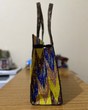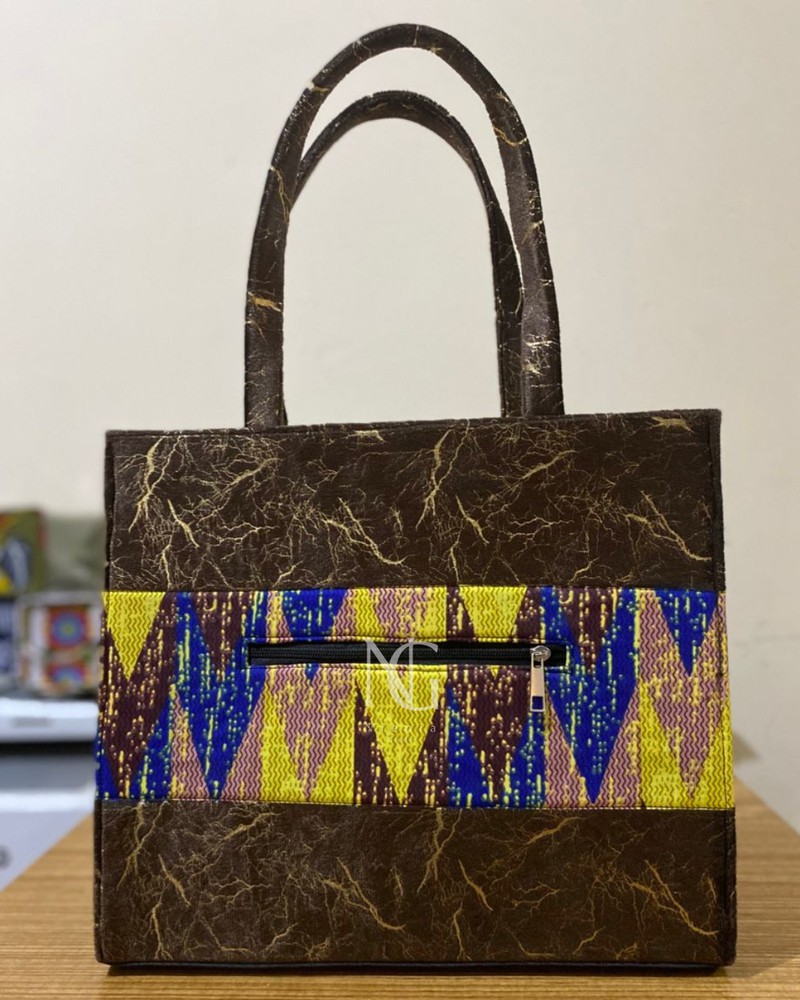 Ce sac marie l’énergie graphique du wax Kente à la profondeur du marron, relevé par une touche de doré subtile. Ce contraste en fait une pièce à la fois vive et raffinée, idéale pour affirmer sa personnalité avec style.