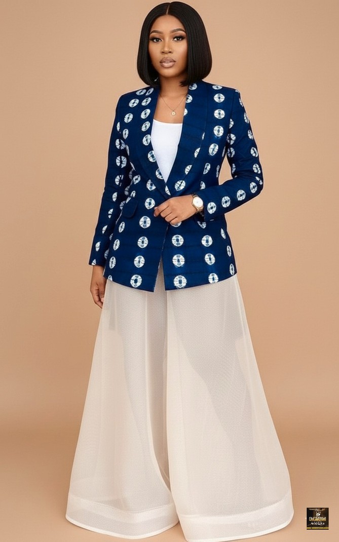 This sophisticated ensemble features a tailored blazer meticulously crafted from authentic Adire fabric, a traditional Nigerian indigo-dyed textile, showcasing a striking white circular motif against a deep navy blue background. The blazer is structured with classic lapels and a single-button closure, providing a sharp, professional silhouette that contrasts beautifully with the voluminous, floor-length skirt made from a delicate, breathable white mesh organza. This fusion of heritage craftsmanship and modern avant-garde design makes it an ideal choice for high-fashion events, corporate galas, upscale garden parties, or creative weddings where you want to make a bold, culturally-rich statement.