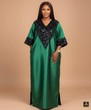 This luxurious caftan maxi dress is a show-stopping piece, crafted from a rich, jewel-toned emerald green satin fabric that offers a beautiful drape and luminous sheen, perfect for glamorous occasions. The traditional, straight-cut caftan silhouette features wide, elegant sleeves and a floor-length hem, prioritizing comfort without sacrificing high fashion. The design is elevated by sophisticated black sequin embellishments that dramatically frame the deep V-neckline and adorn the wide cuffs of the sleeves, creating a dazzling contrast against the vibrant green. Finished with a subtle black trim along the edges for definition, this gown embodies effortless luxury and sparkle, making it the perfect choice for festive gatherings, holiday parties, or any event where you want to shine.