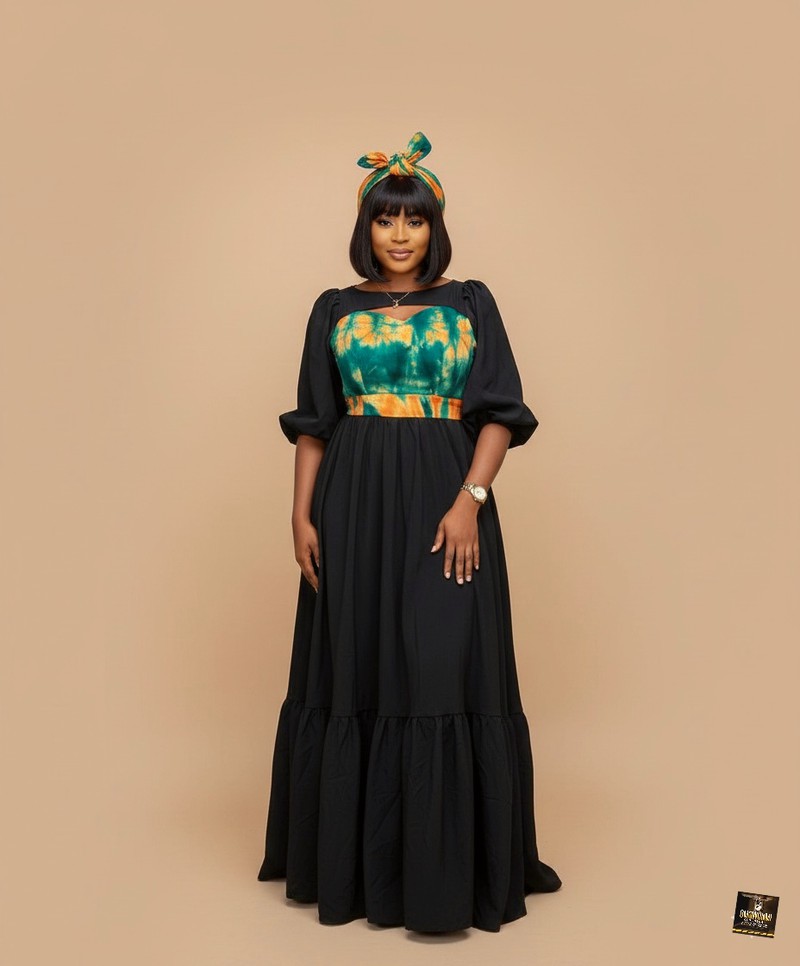 Radiate elegance in this sophisticated maxi-length gown, a stunning fusion of modern tailoring and rich African heritage. The dress is meticulously crafted from premium black crepe, chosen for its fluid drape and wrinkle-resistant quality, ensuring a flawless silhouette from day to night. At the heart of the design is a structured bodice featuring authentic hand-dyed Adire fabric in a mesmerizing green and violet pattern, framed by a chic crescent cut-out and feminine puff sleeves. This vibrant ensemble, complete with a matching headwrap, is the ultimate choice for high-profile weddings, gala events, or festive celebrations, offering a bold yet graceful look for the woman who values artisanal craftsmanship and contemporary style.
