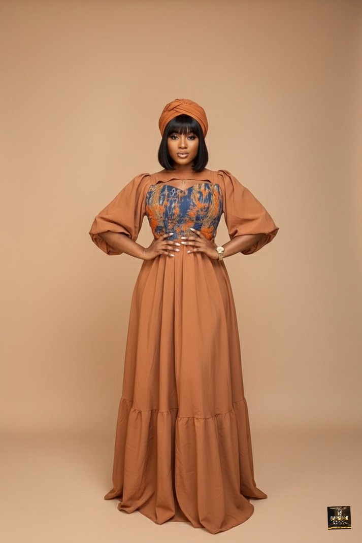 Radiate elegance in this sophisticated maxi-length gown, a stunning fusion of modern tailoring and rich African heritage. The dress is meticulously crafted from premium brown crepe, chosen for its fluid drape and wrinkle-resistant quality, ensuring a flawless silhouette from day to night. At the heart of the design is a structured bodice featuring authentic hand-dyed Adire fabric in a mesmerizing blue and violet pattern, framed by a chic crescent cut-out and feminine puff sleeves. This vibrant ensemble, complete with a matching headwrap, is the ultimate choice for high-profile weddings, gala events, or festive celebrations, offering a bold yet graceful look for the woman who values artisanal craftsmanship and contemporary style.
