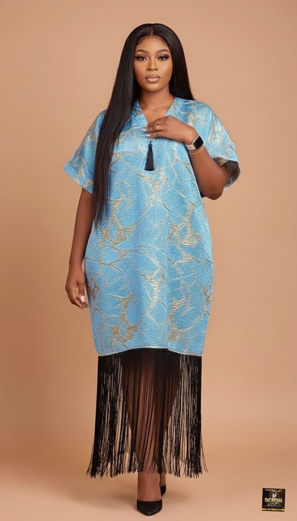 The Ocean Dusk Boubou is an emblem of effortless sophistication, designed to command attention at any distinguished event. This luxurious, knee-length kaftan is rendered in a sky-blue brocade fabric, intricately woven with a subtle gold metallic pattern, giving it an opulent texture and glow. It features a graceful V-neckline and loose, flowing short sleeves for comfortable, classic African elegance. The drama is concentrated at the hemline, where a dense, ankle-to-floor-length black fringe takes over, creating striking movement and visual contrast that is perfect for wedding receptions, exclusive cultural celebrations, or glamorous evening parties. Material: Brocade Color: blue