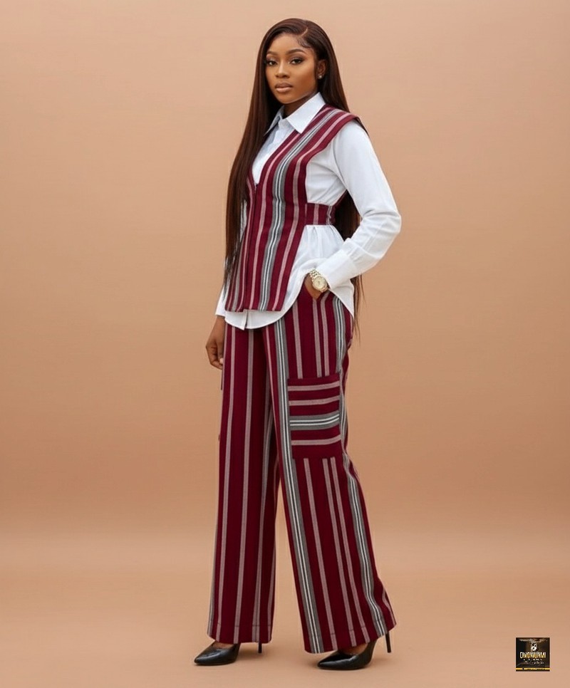 A contemporary, high-fashion three-piece ensemble combining a blouse, a vest top, and wide-leg trousers. The suit components (vest and trousers) are constructed from a sturdy woven textile (Aso Oke) featuring striking vertical stripes in deep burgundy/red, white, and gray. A fitted, V-neck waistcoat designed to be worn over a button-down shirt. It features a cinched peplum waist detail for a feminine and structured shape. High-waisted wide-leg trousers with large, functional cargo-style patch pockets that creatively utilize the textile's stripe pattern for a modern, architectural look. Power dressing with cultural heritage. This ensemble is sharp, confident, and ideal for business meetings, conferences, or upscale daytime events. Material: Handwoven aso-oke, cotton Color: Multicolor