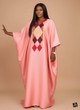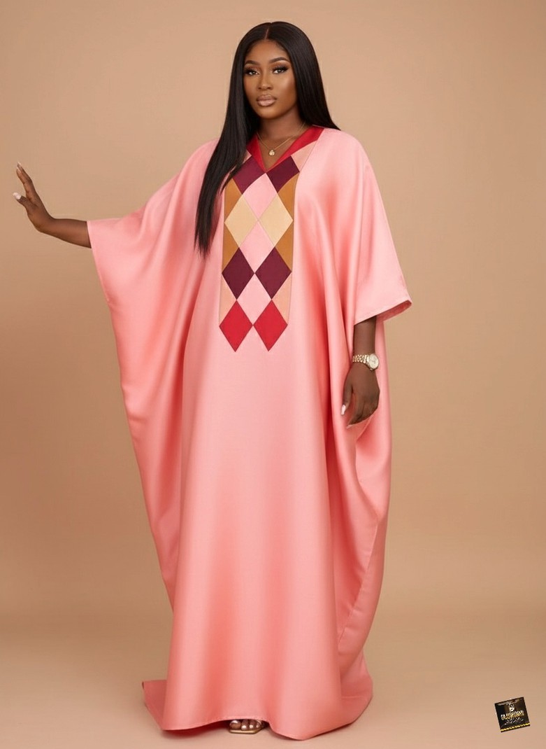 This absolutely elegant Kaftan dress features a luxurious, flowing silhouette crafted from a soft, muted coral-pink fabric with a beautiful drape, offering both comfort and sophistication. The classic maxi-length caftan shape is elevated by a distinctive argyle-inspired diamond pattern centered on the bodice, spanning from the V-neckline down the chest. This striking yoke detail is created using contrasting panels in shades of deep maroon, bright raspberry, muted blush pink, and a warm tan, meticulously bordered by a fine maroon trim that also lines the neckline. This refined combination of soft color and graphic pattern makes the dress a standout piece, perfect for formal daytime events, special celebrations, or occasions where relaxed elegance is key.