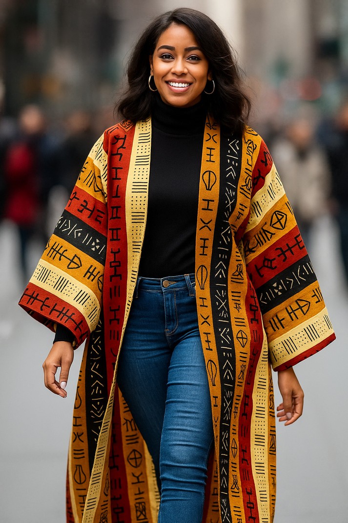 Affirme ton style avec ce kimono long inspiré des motifs traditionnels africains.