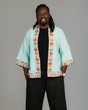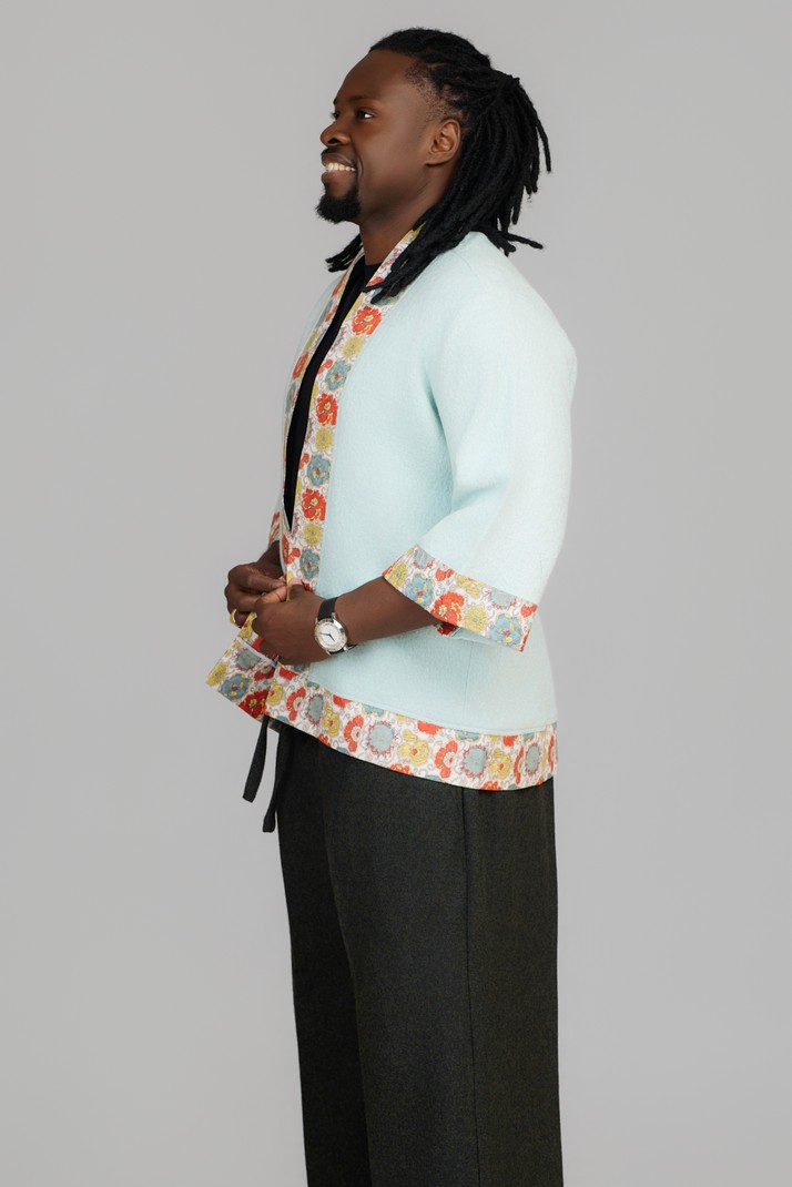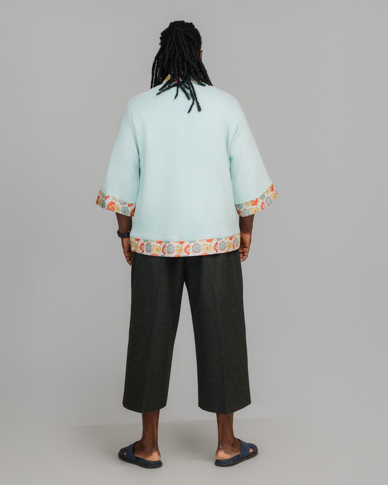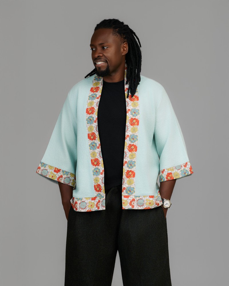 Le Kimono “Yémissi” allie douceur et caractère. Sa teinte bleu clair met en valeur des bordures fleuries inspirées des textiles traditionnels africains, créant un contraste raffiné et lumineux. Une pièce distinctive, pensée pour ceux qui affirment leur style avec subtilité.
