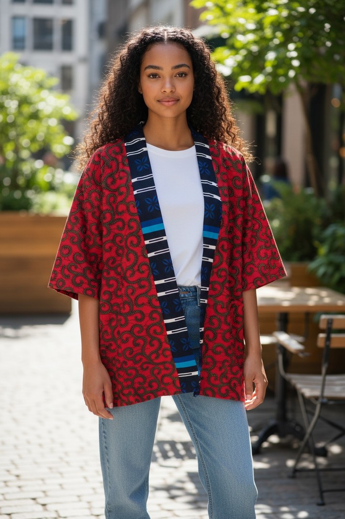 Kimono rouge et bleu en Wax mi long veste mi longue pour l’automne ou le printemps