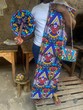 This is a beautiful set which consist of 5.5m(6 yard) pure cotton kitenge,with a matching african fan and handbag.The fabric offers a large range of possibilities for your creativity which includes making of any type of clothes,handbags,table runners,curtains,beddings and many other things.