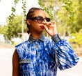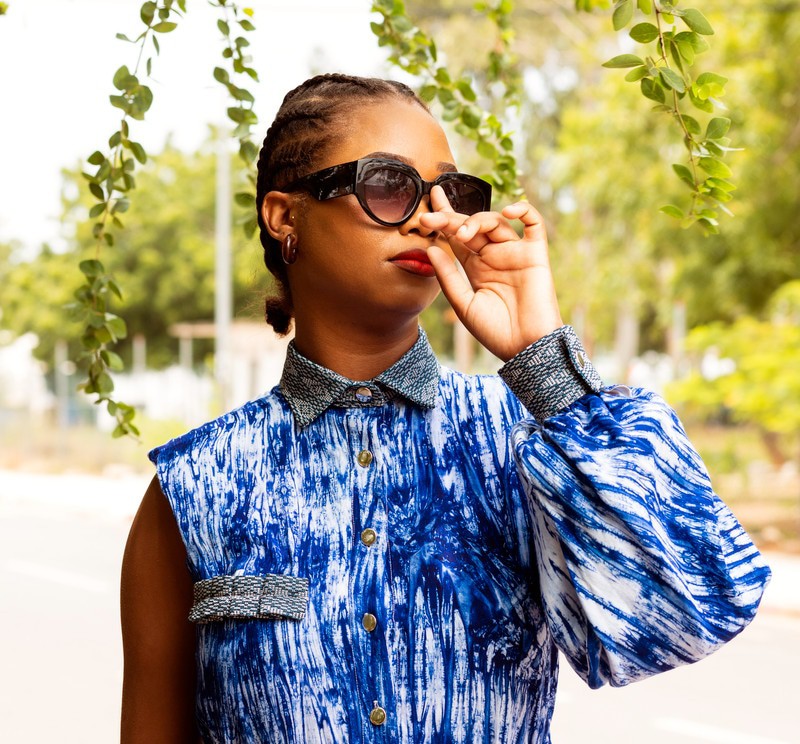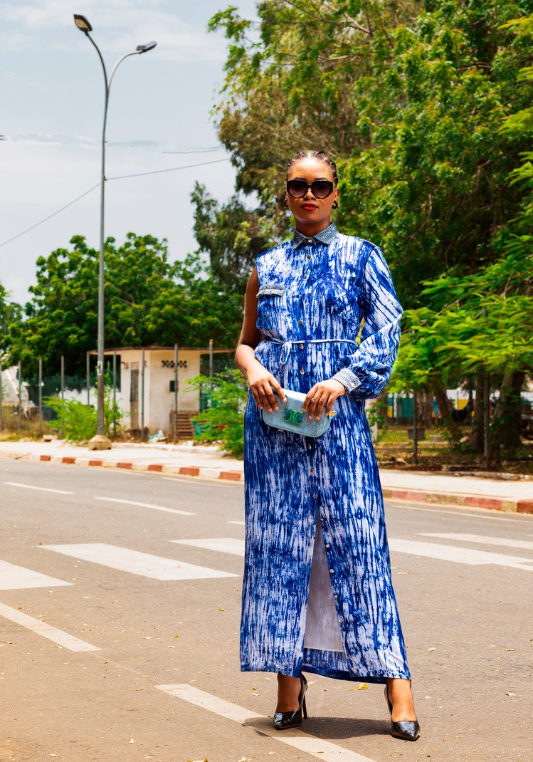 Elle est sublimée au niveau du col, de la poitrine et du poignet par un pagne tissé Manjack travaillé à la main par des artisans sénégalais. Au niveau du corps, le tissu choisi est le batik mauritanien