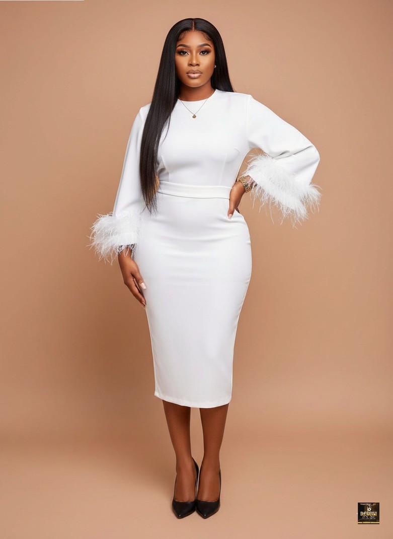 This striking dress offers a blend of corporate chic and playful glamour, defined by a tailored sheath or pencil silhouette that hugs the body before ending elegantly just below the knee. The dress is constructed from a smooth, substantial stretch-crepe fabric in a crisp white, ensuring a flattering, structured fit that maintains comfort and shape throughout the day. The design is kept clean and minimal, featuring a sophisticated round or boat neckline and a tailored bodice with precise waist definition, allowing the dramatic ostrich or marabou feather trim on the cuffs of the three-quarter or full-length sleeves to become the focal point. This glamorous detailing elevates the dress, making it an exceptional choice for occasions such as upscale business luncheons and networking events, formal office wear or presentation days, elegant cocktail receptions, church services, or even as a chic, sophisticated look for a bridal shower or rehearsal dinner.