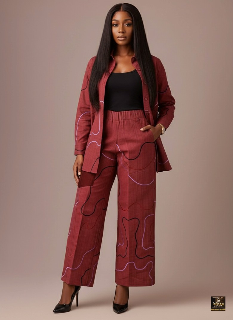 A trendy, relaxed trouser set in a rich Maroon/Burgundy. The fabric is subtly textured handwovenaso-oke, overlaid with abstract, flowing Black and Lilac line patterns. The set includes a straight-cut, button-up jacket/overshirt and wide-leg trousers, styled effortlessly over a black camisole. Ideal for Fashion-forward outings, arts events, casual Fridays.