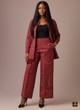 A trendy, relaxed trouser set in a rich Maroon/Burgundy. The fabric is subtly textured handwovenaso-oke, overlaid with abstract, flowing Black and Lilac line patterns. The set includes a straight-cut, button-up jacket/overshirt and wide-leg trousers, styled effortlessly over a black camisole. Ideal for Fashion-forward outings, arts events, casual Fridays. Material: handwoven aso-oke Color: Burgundy